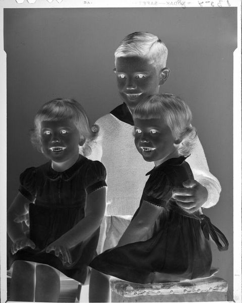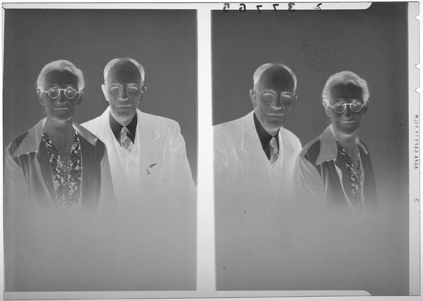 Editor: This is an untitled family portrait by Lucian and Mary Brown. Even as a photographic negative, the subjects seem so full of life! What strikes you about it? Curator: It's funny how the reversal of light and dark adds this almost ghostly quality, isn't it? Yet, there's a sweetness here. It’s a window into a very specific moment. I wonder what they were thinking about. Editor: Maybe anxieties about the future, or just the daily grind? Curator: Perhaps. Or maybe just hoping the little one wouldn’t spit up before the shutter clicked! It's a charming memento, whether intentional or not.