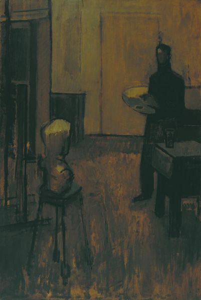Curator: The piece before us, titled "The Blue Chairs II," was completed in 1976 by Panayiotis Tetsis. There’s a beautiful economy to his forms here. Editor: The dominant impression, I think, is its melancholic atmosphere—even before one knows the title points towards "blueness." I get this sense of waiting, a suspended moment… Curator: Indeed, the cool palette creates a feeling of solitude, which could be linked to a potent cultural symbol. Chairs often represent gatherings, discussions, society itself… These are stark, singular. Perhaps signifying absence. Also, consider the cultural symbolism connected with coffee, and in many respects, how modern society has progressed. Editor: I’m also immediately struck by how thickly he’s laid on the acrylic paint – almost impasto in places. You can see the texture and how he must have worked the surface. Do we know where it was created or what might have spurred this particular vision? Was acrylic paint common or a choice that stood out in the time? Curator: Acrylic use was still gaining momentum in painting, offering different textural and drying capabilities. I perceive symbolic possibilities embedded within. Could this speak to isolation brought through rapidly changing means and modes of consumption? Editor: I suppose my eye drifts more directly to questions of labour, where the actual artistic endeavor is highlighted as an almost manufactured object. Perhaps this piece functions more literally than metaphorically – how "authentic" can "modern art" really be with this newer material? Curator: Both aspects may be simultaneously present. The way Tetsis worked with material could offer an emotional dimension to the narrative here, a modern reinterpretation of a simple human experience. He transforms basic shapes of chairs and mugs into cultural markers that reveal collective moods or a moment of time. Editor: I like that thought! The materiality allows us to understand it's both about craft *and* more than craft; something real is being reflected beyond the objects portrayed, making us question all layers, material and emotive. Curator: The symbols invite you to project, and in a sense, the blue color casts its aura—to create emotional resonance beyond merely its construction. Editor: And maybe that’s why these 'Blue Chairs' remain captivating decades after their making—the combination of tangible process and elusive meaning is rather resonant.