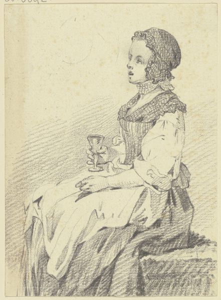 Editor: This is “Young Woman Pouring a Glass from a Pitcher” by Coenraad Hamburger, made in 1849, using ink. It’s a sepia toned drawing and, overall, there's a sense of quiet domesticity about it. What do you see in this piece? Curator: It evokes a specific cultural memory for me. The young woman's attire, particularly her cap, anchors her firmly within the visual traditions of 19th-century Dutch genre painting. Her pose is so focused, and reminds me of Vermeer’s paintings of women performing household tasks. The pitcher and glass become almost sacramental objects. Are we meant to infer anything beyond a simple domestic scene? Editor: Sacramental? That’s interesting. I just assumed she was getting a drink. Is it because water, or whatever liquid is inside, has significance? Curator: Potentially, yes, consider the history of depicting women pouring liquid; what psychological weight does the act of pouring have? Liquids have a rich symbolic life—associated with cleansing, transformation, and even libations to the gods. Could it represent a transfer of knowledge, a blessing, or a hidden, ritualistic moment? Or it is just…water? Editor: So the seemingly simple scene might be alluding to deeper meanings encoded in cultural rituals? It gives everyday gestures an almost mythical importance. Curator: Precisely! Visual culture often borrows from itself across centuries, giving what might appear mundane, powerful resonance. Does this expanded view change how you perceive the work? Editor: Absolutely, I’ll never see someone pouring a drink the same way again. Thanks, it feels like I've been given a secret decoder for paintings!