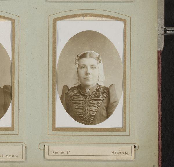 Curator: This gelatin silver print, dated between 1883 and 1910, is attributed to Johannes Laurens Theodorus Huijsen and is titled "Portret van een vrouw," or Portrait of a Woman. It's currently held here at the Rijksmuseum. Editor: It strikes me immediately as a rather sober and straightforward depiction. The sitter gazes directly out, her expression somewhat…unyielding? It's a very composed portrait. Curator: Indeed. In the late 19th century, photographic portraiture gained prominence not just as an artistic form but as a vital element in constructing social identity. Consider that portraits like these were becoming accessible to a wider segment of the population, not solely the aristocratic elite. It documents the burgeoning middle class. Editor: Right, the advent of photography offered new ways of memorializing oneself. Her gaze certainly communicates something of that burgeoning confidence. Her jewelry, for example. Are those mourning symbols in her brooch and necklace? Curator: It’s quite possible. Accessories frequently encoded messages about status, allegiances, or life events. This type of jewelry may reflect a personal sentiment in a more modest and discreet way, while also maintaining conventional propriety. Editor: So the visual language provides both information and context. It's intriguing to ponder what messages she intended to send—and what meaning these accessories might hold to later viewers. Curator: Exactly, and beyond the immediately identifiable symbolism, there are layers of cultural nuance. It serves as a microcosm of how ordinary people wished to be remembered. A record for her family and descendents to cherish and identify with. Editor: A tangible connection to the past. Well, this glimpse into the world and identity of a woman from over a century ago leaves me wondering about her individual story beyond this portrait. Curator: Agreed. These pieces are potent historical evidence; snapshots that are representative of how people chose to portray themselves in their unique contexts, and to influence how history might eventually view them.