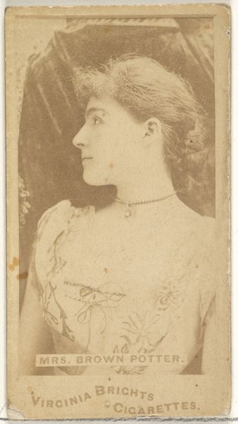 Editor: Here we have "Mlle. Crouzet" from the Actors and Actresses series, a photograph, drawing and print, dating from the late 1880s, originally made for Virginia Brights Cigarettes. What strikes me immediately is the commercial purpose. How does that affect how we see it as art? Curator: That’s a key question. These were trade cards, yes, but we can examine their societal role. Think about the rise of celebrity culture at the time, and how tobacco companies were using figures like Mlle. Crouzet to promote their products. These images helped disseminate ideals of beauty, performance, and fame, contributing to the formation of public personas. Editor: So, these cards are basically early advertisements functioning as pop culture? Curator: Exactly. Consider who got to be represented and how. The selection of actors and actresses reflects certain social biases, perhaps favoring established performers or aligning with particular notions of beauty that were profitable to tobacco companies. Also, were performers properly compensated, or did they benefit at all from their images being widely circulated? Editor: It's interesting to consider the power dynamics involved in these images. And how the cultural impact stretches beyond advertising. Curator: Precisely! How museums collect and display pieces like this also affects our perception, imbuing a mass-produced image with an aura of art, while the history of its usage risks getting obfuscated. Editor: I see how it prompts us to think critically about both the creation and the modern presentation of it. Thanks for shedding some light. Curator: My pleasure. It's a reminder that every artwork is embedded in a web of social, cultural, and political forces that continue to shape its meaning today.