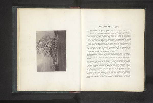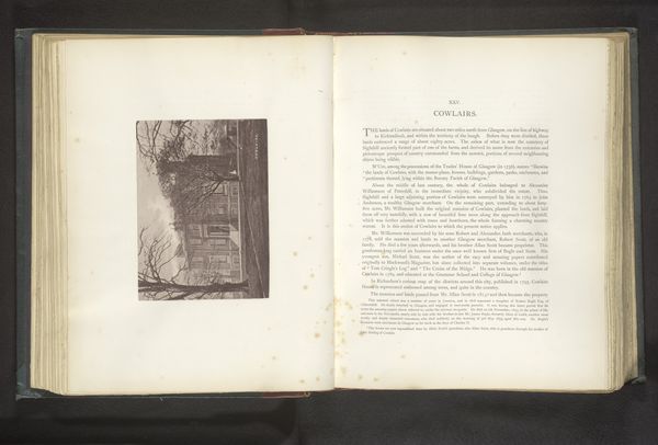 Curator: Here we have Thomas Annan's photograph "Ballancleroch," dated before 1878. What strikes you first? Editor: The overall impression is quite somber, isn’t it? The gray tones lend a melancholic feel to the scene. It feels like peering into a fading memory. Curator: Let's delve into Annan’s process. As a photographer primarily focused on documenting social conditions and architecture, his images like these became key artifacts in understanding Victorian-era shifts and material conditions. Editor: Indeed, but the photograph also functions as an evocative symbol. The building itself stands as a visual anchor, possibly signifying stability, while the enveloping landscape might represent the passage of time and the ephemerality of existence. Curator: What I find particularly compelling is the tangible texture. We're looking at a print, but you can almost feel the rough stone of the building, the dense foliage surrounding it. This connects to the very real conditions it represents: property, resources, labor... Editor: From an iconographic standpoint, the light and shadow at play here could suggest something further, too. The way the sunlight filters through the trees almost seems like a divine presence watching over this dwelling and by extension perhaps the family within? Curator: And how fascinating that it is placed in the pages of a book, perhaps removed now from the actual material conditions into the realm of record. Editor: A record perhaps aiming to transform the familiar landscape into something symbolic and lasting. Food for thought! Curator: Absolutely! This photograph lets us touch the past through materials and method, giving historical narratives tangible form. Editor: And for me, Annan's photograph transforms an old estate into a powerful emblem of permanence and the slow, patient forces of nature and history.
