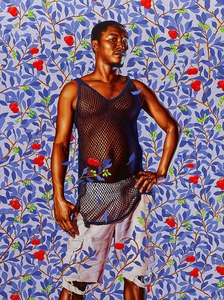 Kehinde Wiley painted this piece, ‘Saint John The Baptist In The Wilderness’, using a high gloss oil paint, in his signature colourful style. The piece has such a distinctive approach to mark making, because the artist wants us to understand artmaking as a process; as something which is constructed and which has its own rules. I find myself drawn to the surface of this piece. The paint is smooth, not thick, but it’s also incredibly saturated and opaque. It's an assertive surface! I love how the colours almost vibrate against one another, pushing and pulling our perception. And then you notice these meandering leaves and you realize that the background is actually very intricate! The figure stands confidently against this vibrant pattern, the geometry of their top and dress is echoed and subverted by the organic chaos of the floral background. Thinking about this, I'm reminded of someone like Elizabeth Murray. This piece embraces ambiguity and multiple interpretations over any kind of fixed meaning.