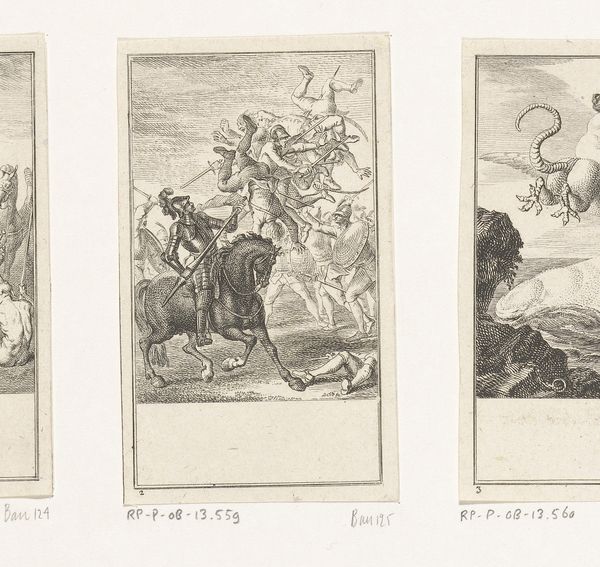 Curator: At the Rijksmuseum we have an engraving by Daniel Nikolaus Chodowiecki from 1771, entitled "Ariosto in razernij ontstoken." The scene pulsates with dramatic tension, doesn't it? Editor: Indeed. Even with the monochromatic palette of the engraving, there is a visceral quality to it. The figure being hurled through the air – his body seems to be caught in this dramatic arc of movement. Curator: The work illustrates a moment of intense conflict, but this conflict is staged in the style of Baroque classicism and restraint with very ordered, balanced sections. Understanding the social and intellectual context is key here. Chodowiecki lived during the Enlightenment. This piece, depicting Orlando Furioso's madness, reflects broader anxieties about reason versus passion, and the precariousness of sanity in a tumultuous world. Editor: The lines are remarkably crisp. And notice the dynamic composition, leading the eye from the powerful, centrally placed figure outwards toward the chaos unfolding around him. The figures almost look like they were captured with a camera due to the high levels of detailing. This is definitely where Chodowiecki is succeeding. Curator: What I find intriguing is the tension between the epic narrative it depicts and the relatively small scale of the engraving. This speaks to the accessibility of art during that period, disseminating stories and ideas beyond elite circles. How do you feel this narrative influences your reading? Editor: Well, my eye is first caught by this powerful, central, heroic figure in the image, a clear statement to the impact of the man during the conflict of this composition. The artist also used shadow well to show movement. Curator: I see him rather as a vulnerable protagonist succumbing to irrationality. A cautionary tale, perhaps, for an age that championed reason above all else. Editor: Perhaps so. Though from a formal perspective, the careful construction draws one immediately into its narrative depth. It's quite gripping. Curator: Absolutely, it serves as a visual record of complex social debates and offers commentary on the nature of sanity and societal order. Editor: Yes, and by recognizing how it achieves balance despite the chaos, we’re provided access into the mind and intentions of Chodowiecki, himself.