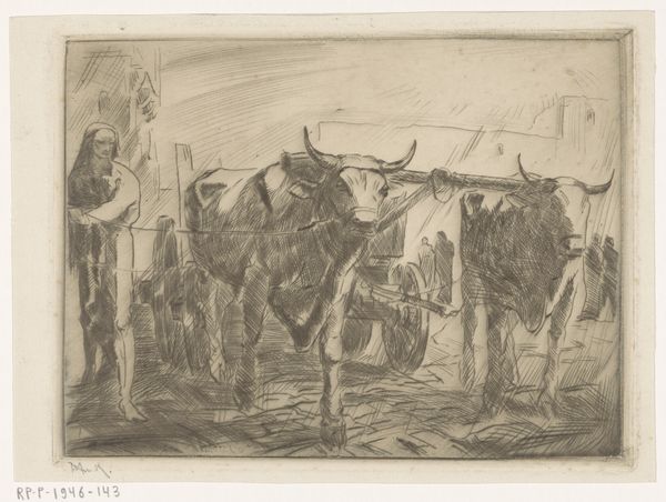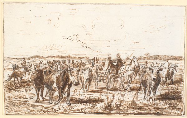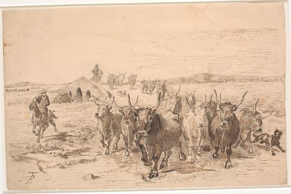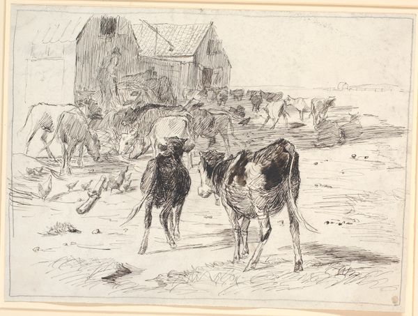 Editor: This drawing, “Heste, kalve og gæs ved Hollænderbrønden på Saltholm,” by Theodor Philipsen, dating from 1880, depicts horses, calves, and geese by a well. It feels like a simple, straightforward depiction of rural life. What do you see in this piece, beyond that initial impression? Curator: Beyond the seeming simplicity, this work carries the weight of a changing Denmark. Consider the well: it is not merely a water source, but a symbol of community and sustenance, deeply interwoven with cultural memory. The presence of specific animals is interesting, each having emotional connotations to agrarian societies of the late nineteenth century. Do you notice the absence of industrial imagery, a deliberate choice likely intended to emphasize an ideal of rural life, just as industrialization was transforming the landscape? Editor: So, you are suggesting that it may not be just a simple snapshot of reality, but a kind of… statement? Nostalgia for a disappearing way of life, perhaps? Curator: Precisely. And Philipsen, as an artist working during a period of significant social and economic transition, used the genre-scene tradition, the visual language of rural life, to access a cultural continuity and identity linked to nature and agricultural labour. Look how he's rendered each animal--the goose isn't just a goose. Editor: The geese do have distinct postures and actions. Curator: Their collective presence evokes an archetype—alert, communicative, connected to the domestic sphere. It serves almost as a commentary. Editor: This has certainly made me look at this pastoral scene with a whole new perspective. It’s so much more layered than I first thought! Curator: Indeed, the seeming simplicity is deceptive. Each element is imbued with meaning, carefully placed to evoke an image deeply embedded in Denmark’s collective memory.