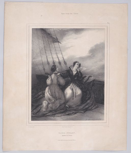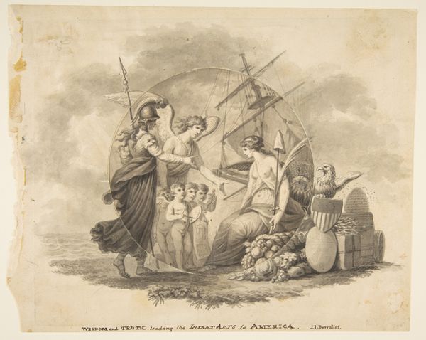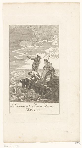 Curator: This engraving, "Peter's Fishing Catch", attributed to Gerhard Ludvig Lahde, and dating from 1765-1833, resides here at the SMK, Statens Museum for Kunst. The print medium offers us a glimpse into the story depicted in the Gospel of Luke. Editor: It's fascinating. There is something immediately compelling about this old engraving style. I am struck by the subtle dynamism created by the many lines, suggesting the shimmering water, and by Peter's stance – so solid, almost triumphant – as he hauls in that impossibly full net. The symbolism is clear and persuasive, don't you think? Curator: Precisely. This moment encapsulates a powerful biblical narrative where the miraculous catch foreshadows Peter's role as a "fisher of men," aligning with broader theological and institutional claims of the Church. The image’s dissemination via prints also contributed to the politics of religious imagery at the time. Editor: The Keys of Heaven resting on the drapery – almost too obvious to notice – it makes the case undeniably. Even the choice of showing a bountiful harvest underscores a spiritual abundance, and the psychological comfort of faith made visible. Look at the humble fishermen in the background; they look in awe. Curator: Right, and placing this particular narrative within a broader artistic context, engraving like this also speaks to shifts in religious pedagogy and the growing importance of visual narratives in popular culture of the era. Note that the Baroque flourish underscores that emotive engagement. Editor: I'm interested by how this piece uses familiar archetypes to convey complex spiritual ideas simply. You have the rugged, hard-working fisherman and the authoritative Saint; how accessible, in a time of widespread social change. The symbolism bridges a gap between the mortal and the divine. Curator: Absolutely. The success and endurance of these kinds of prints rested, I think, on how effectively they could disseminate very particular social and religious values. Editor: Reflecting on it, this unassuming print cleverly merges accessible imagery with potent symbolism. It acts not just as religious art but almost as a piece of collective memory. Curator: Indeed, it highlights the enduring appeal of faith communicated through powerful visual narratives shaped by very real social and political demands.