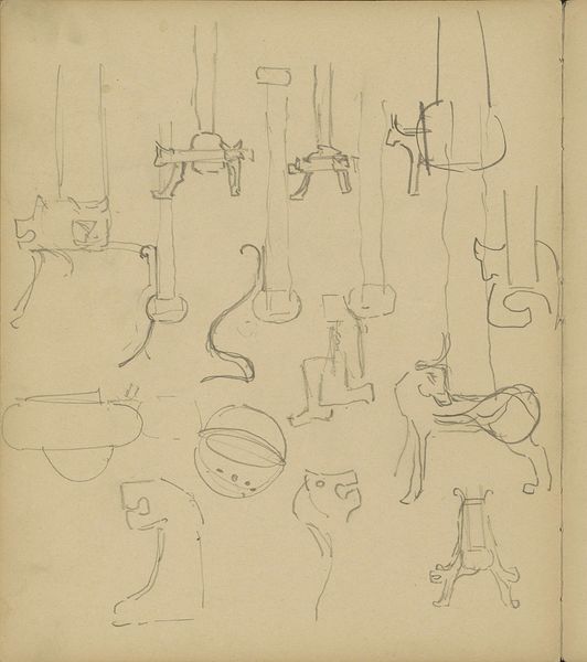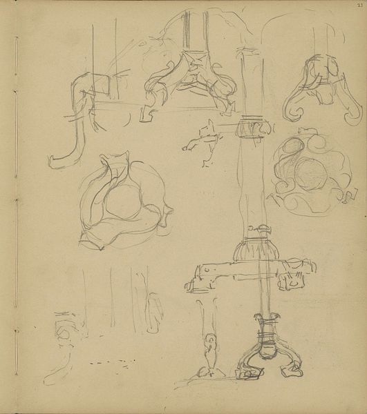 Carel Adolph Lion Cachet made these "Ontwerpen voor het onderstel van een tafel" in the early 20th century, using pencil on paper. It’s a flurry of ideas, the kind of drawing that feels like thinking out loud. The marks are tentative, searching, almost like the artist is feeling his way through the possibilities. Look at the bottom right, you can see this curly flourish, repeated with slight variations across the sheet. It’s as if the artist is testing it out, seeing how it might work in different contexts. It makes me think about the way artmaking is a constant conversation, we're always drawing on what came before, riffing on ideas, and pushing them in new directions. These table legs remind me of the sculptures of Brancusi, both share a commitment to simplicity and elegance. It’s a reminder that art is always evolving, always in dialogue with itself.