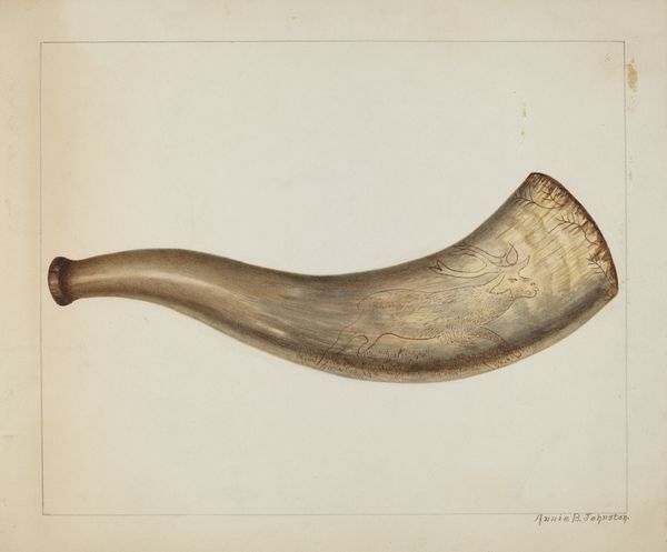 Curator: Let’s turn our attention to Alfred Koehn's "Powder Horn," a watercolor and drawing piece created between 1935 and 1942. It depicts, rather straightforwardly, two powder horns. Editor: My first impression is one of quiet fragility. The muted colors and delicate lines lend it a subtle, almost ethereal quality, don't you think? It speaks of something aged and precious. Curator: Precisely. Given the timeframe of its creation, during the Depression, these horns become more than mere objects. They symbolize self-reliance, a reaching back to colonial American values amidst widespread economic hardship. They represent a certain idealized version of American identity during the colonial era. Editor: Absolutely. I'm particularly drawn to the process. These aren't just drawings; they're renderings that demonstrate an intense material focus. We see the horn's surface painstakingly replicated in watercolor, complete with what looks like detailed scrimshaw work, probably intended for ornamentation. Curator: The etched decorations carry their own weight. They evoke a longing for a mythologized past and speak of a specific craftsmanship linked with the everyday lives of colonial subjects. We see glimpses of text and pictorial narratives, suggesting the horns functioned as both practical tools and sites of identity and remembrance. Editor: And considering Koehn was creating this nearly two centuries after their widespread usage, we are confronted with the question of who it speaks to. As reproductions made well after their time, these serve not just as artifacts, but as deliberate engagements with ideas of preservation and labor in a new, industrialized era. The use of watercolor, not exactly the toughest material, makes me think it speaks more about sentimentality than self-defense. Curator: That's a valid point. It reframes the understanding from a declaration of frontier independence to an introspective glance at history’s filtered lens and collective anxieties surrounding American ideals and narratives of its founding during economic insecurity. Editor: So, instead of viewing them simply as artistic representations of utilitarian items, it makes me think about how our collective memory chooses to retain artifacts and concepts that make up our cultural history. Curator: An important lens that can help bring depth to these depictions. Thanks for lending that view, hopefully our listeners appreciate these details in viewing these watercolor renditions. Editor: Indeed, appreciating historical depictions such as these allows us a tangible encounter, engaging our relationship with the materials and circumstances of artmaking, but also in considering our modern relationship with historical events that influence the culture we experience in real time.