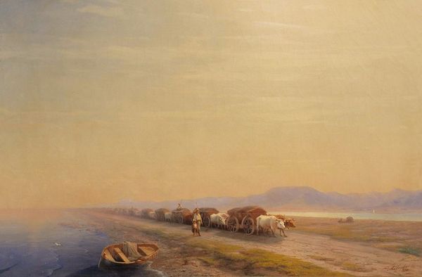 This is Ivan Konstantinovich Aivazovsky's vision of an ox train on the steppe, captured with oils. Notice the long line of ox-drawn carts stretching towards the horizon. This caravan is a potent symbol of journeys, migrations, and the movement of peoples. The oxen themselves evoke ancient agricultural practices and pastoral life, reminiscent of classical images of bucolic existence. In ancient Crete, bulls were venerated as divine symbols, embodying fertility and strength. The connection between humanity and these animals runs deep, tapping into our collective memory. Like the ships that appear in Aivazovsky's marine paintings, this procession embodies human endeavor against the vastness of nature. It expresses a yearning for connection with the earth. These motifs echo through centuries, reappearing in various forms, demonstrating our continuing quest for meaning.