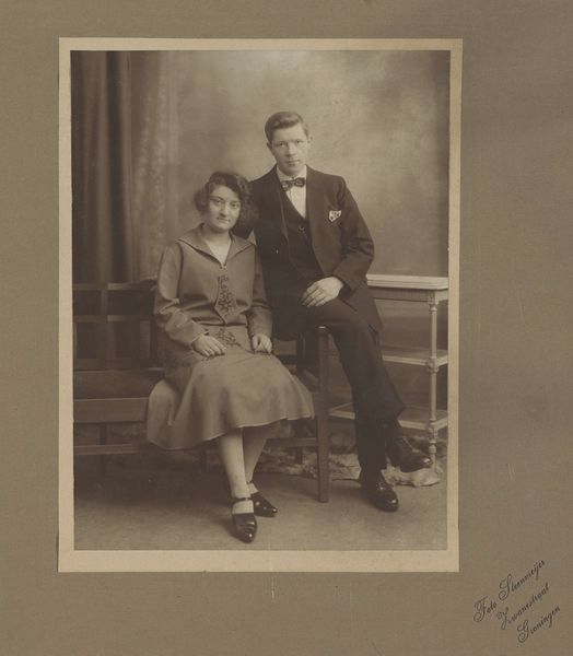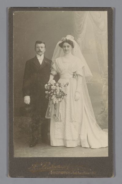 Curator: Here we have a striking photograph, believed to be from around 1927, titled "Portret van Pètrus Jan Rienstra van Stuyvesande en Jacoba Went bij hun verloving" by Julius Heinrich Hisgen. Editor: It's remarkable, isn't it? The formality and the soft sepia tones give it an air of gentle, almost melancholic, nostalgia. It certainly feels posed in a specific, very deliberate way. Curator: Absolutely. Consider how carefully arranged it is: the composition, with the couple standing side-by-side, framed against what appears to be a painted backdrop, lends a theatrical quality to this intimate moment. In its time, that kind of highly composed approach elevated the individuals. Editor: Yes, the backdrop feels almost like a stage set, doesn’t it? Almost as though they are performing their roles. And yet, within that formal setting, there's a palpable sense of vulnerability. It’s almost voyeuristic to observe such private events repurposed as public artifacts. Curator: Note how the photographer has captured elements such as the bride’s flower corsage, the groom’s smart black tuxedo. Those were important, codified messages of the aspirations of the emerging middle class in the early 20th Century, with the underlying values associated with prosperity. Editor: That’s interesting; do you feel like the presence of wedding photography like this affected wider artistic trends in the long-term? In the way it emphasized public consumption of romantic love, even commodifying it in many senses. Curator: Undoubtedly, the mass proliferation of photographic imagery created a feedback loop where representations started shaping perceptions. Consider, then, that this work is preserved and is available for public engagement – there is so much to observe in our ongoing cultural negotiation between documentation, marketing, and artistic integrity. Editor: Very true. There’s such a compelling story embedded within the stiff poses and muted tones. Curator: It serves as a wonderful lens through which we can understand both personal histories and broader societal shifts. Editor: Absolutely, a poignant snapshot of a bygone era that resonates even now.
