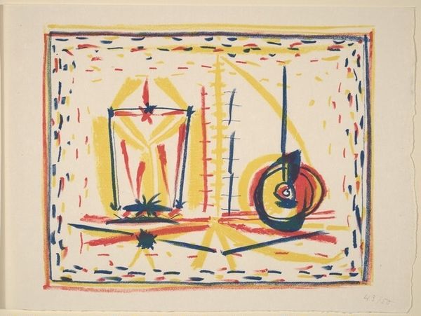 Editor: Right now, we're looking at "Composition," a linocut print by Pablo Picasso from 1946. It’s so striking; the simple shapes and colors, the red, yellow, and blue, almost feel like a child’s building blocks. How do you interpret this work, especially considering the historical context? Curator: Well, it’s crucial to consider when this piece was made. 1946… Europe was reeling from World War II. Picasso, a major cultural figure, created this geometric abstraction. Was this a deliberate move away from overtly political art? Or was it, perhaps, a visual language to process the fragmentation and rebuilding of society itself? The simple forms, the act of *re*composing, speak volumes. Editor: So, you're suggesting this seemingly simple artwork may reflect a larger societal healing process? The art world was really different after the War... Curator: Absolutely. The dominance of Paris as the art world's undisputed capital had begun to crumble. Abstract Expressionism was gaining ground in the U.S., fueled by a different kind of cultural energy and, frankly, funding. This piece sits right at the cusp of that shift. Picasso may be deliberately grappling with those changes, simplifying to communicate to a broader audience after the chaos. Editor: That’s fascinating. So, instead of just being a pleasing arrangement of shapes, it’s participating in a bigger dialogue about the role of art post-war? I hadn't considered how the shift in art's location affected even established artists. Curator: Precisely. It’s not just *what* is depicted but *why* and *where* it's depicted. Considering how art functions within these power structures is always vital. Editor: I will remember that! It’s so helpful to understand the broader context to truly appreciate a piece. Thanks for the insight. Curator: My pleasure, looking at art through the lens of history allows it to speak volumes.