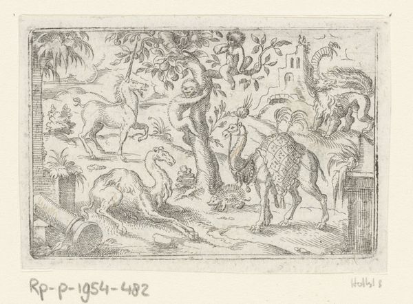 This small etching presents us with an array of exotic creatures, including elephants, a rhinoceros, a lion, and a griffin. The griffin, a hybrid of lion and eagle, embodies strength and vigilance. Note how the lion and griffin are posed: this motif has ancient roots in heraldry and mythology, symbolizing courage and protection. We see it echoed through the ages—from medieval crests to modern emblems. The depiction of a lion and a griffin facing each other has appeared on emblems from different cultures and times, often representing a struggle of power. This juxtaposition of real and mythical animals invites us to consider how we perceive the world, blurring the lines between reality and imagination, engaging our subconscious. In this bestiary, the animals become more than their physical forms, representing psychological states. The cyclical recurrence of these symbols reminds us that cultural memory is not linear. Instead, it is a dynamic process of revival and reinterpretation. Each era infuses old forms with new meaning, reflecting collective dreams.