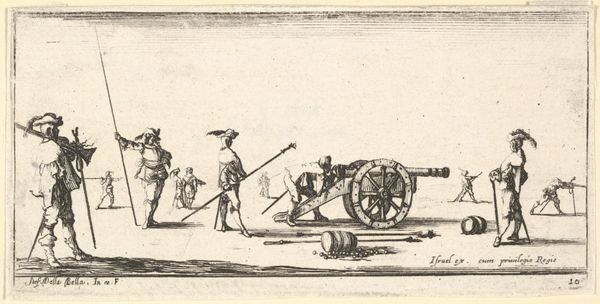 Editor: This is Jacques Callot's "Exercise with Canon, Aiming." It's a small, detailed print. The linear precision gives it a somewhat detached, observational feel. What strikes you when you examine the composition? Curator: Observe how Callot uses line to create a sense of depth and perspective. Note the contrast between the static cannon and the dynamic poses of the figures. The etching technique itself lends a certain crispness and clarity. How do you see the use of negative space contributing to the overall impact? Editor: The emptiness around the figures isolates them, almost like specimens under observation. I appreciate your insight into the function of line. Curator: Indeed. The formal elements work together to create a study in movement and stillness, action and observation. A fascinating example of Callot’s technique.