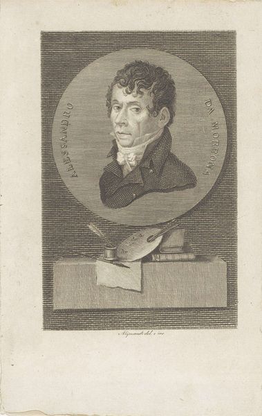 Editor: Here we have Philippus Velijn’s "Portret van Adrianus Cornelis Schenk", an engraving from 1832. It's quite a striking image! I am really drawn to the detailed hatching that gives so much texture to his coat. What do you see in this piece? Curator: The brilliance of this work lies precisely in the meticulous execution of the engraving. Observe the use of line: varied pressure and density creates form and volume from what is essentially a flat plane. Consider how the engraver built depth, moving from light to shadow. Editor: It is amazing how they captured the light. How does the composition contribute to the work? Curator: The stark contrast between the subject and the plain background forces one's gaze towards the face. But the artist uses a three-quarter view, a strategic choice that injects dynamism, deviating from a static, symmetrical portrayal. What semiotic elements are perceivable, and how do these forms contribute to our interpretation? Editor: It feels very direct and honest. So much expression is conveyed through the textures created by those simple engraved lines. What is important for me, is to reflect on all the things one can accomplish with just one material! Curator: Indeed! By analyzing its intrinsic visual vocabulary, we can come to appreciate its technical complexity and aesthetic impact on its own terms, divorced from concerns about social relevance. This helps reveal essential elements of an artwork.
