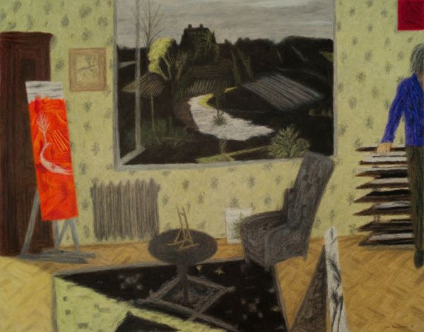 Iwo Zaniewski’s scene of domestic life is rendered with pastels. Despite the title, *Artist’s Childhood*, this is not a nostalgic or sentimental image, but rather an unsentimental rendering of the artist’s studio and the people who occupy it. The artist situates us within an intimate, yet almost impersonal, space. Two older figures are deeply immersed in their respective design projects. In the lower left-hand corner, a child is also absorbed in building or constructing something with small parts. The scene evokes the quiet moments of creation. Zaniewski captures the quietude of a room filled with activity. The three figures, each engaged in their own worlds, suggest the artist's understanding of family dynamics. The pastel colors and diffused light create a sense of warmth, but also detachment, as each figure remains isolated in their work. Zaniewski invites us to reflect on the dynamics of family, and how these relationships shape our individual identities and creative pursuits.