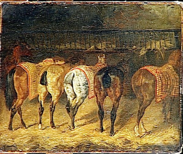 Editor: Here we have Piotr Michałowski's "Polish Krakusi" from 1855, rendered in oil. I’m struck by how the artist captured the feeling of forward motion, and the rather dramatic, almost turbulent atmosphere. What are your thoughts on this work? Curator: The painting’s dynamism is indeed one of its most compelling qualities. Note how Michałowski uses broad, gestural brushstrokes and a muted, almost monochromatic palette. Do you see how the formal qualities, such as the lack of distinct outlines, contribute to the overall sense of movement and urgency? Editor: Yes, it's like the riders are emerging from a kind of hazy, historical fog. It feels very active and somewhat unfinished, too, like a sketch. Curator: Precisely. The ambiguity of the forms, rather than detracting from the work, adds a layer of complexity. How do you think the composition - the arrangement of the riders and their steeds - affects the narrative impact? Editor: The way they're clustered makes them seem united, like a force, but it also obscures individual identities. It’s less about specific heroes, perhaps, and more about the collective action? Curator: An insightful observation. The brushwork itself seems to function as an expressionistic shorthand. By focusing on conveying an essence rather than descriptive accuracy, Michałowski emphasizes the emotional intensity. Editor: So, would you say the formal elements here are driving the overall meaning more than, say, historical context alone? Curator: Precisely. It is not necessarily about representing a specific historical event. Instead, it offers us a visceral and experiential understanding of a moment charged with energy. Editor: I see now. It's a brilliant demonstration of how brushstrokes and composition can construct such a dynamic image. Thanks for helping me analyze that. Curator: My pleasure. Reflecting on its formal structures allows us to decode the image, regardless of how history interprets this artwork.