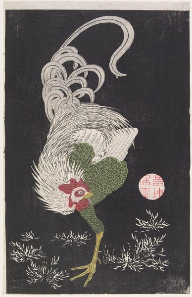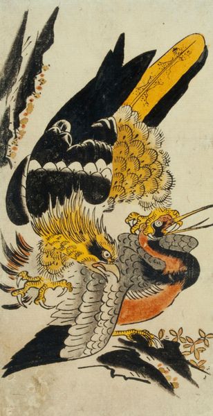Editor: This is "A Hawk Capturing a Crane in Flight," a woodcut print by Torii Kiyomasu I, around 1715, currently held at The Art Institute of Chicago. I am struck by the dynamism captured in such a limited color palette; how would you interpret its formal qualities? Curator: Note the compositional tension: the stark diagonal created by the hawk’s descent is countered by the implied upward struggle of the crane. Kiyomasu has expertly manipulated the line – thick, bold outlines – to define forms and create a sense of immediacy. Do you observe how the stylized rendering of feathers adds to the decorative flatness characteristic of ukiyo-e prints, despite the illusion of depth? Editor: Yes, I see what you mean. It is quite interesting how the print flattens the image yet suggests motion. Is that common for woodcuts of this era? Curator: Indeed. The interplay between depth and flatness is further enhanced by the use of color. Observe the limited palette; predominantly earthy tones, strategically placed to highlight the hawk’s predatory power. Are you perceiving a structural framework built with the interaction between line, color, and shape? Editor: It's clever how the restricted palette creates depth while maintaining a stylistic aesthetic. What I initially read as simply ‘flat’ is a network of shapes. Curator: Precisely! Ukiyo-e prints often prioritize stylized representation over realistic depiction. It’s about conveying essence and motion through a carefully constructed visual language. Considering the interplay of these structural elements and their impact allows for a deeper engagement with the piece. Editor: Thanks for clarifying! The conversation expanded how I see the piece, and my focus shifted from simply what is pictured to *how* it's pictured. Curator: You're most welcome. That is a valuable distinction when approaching any work of art.