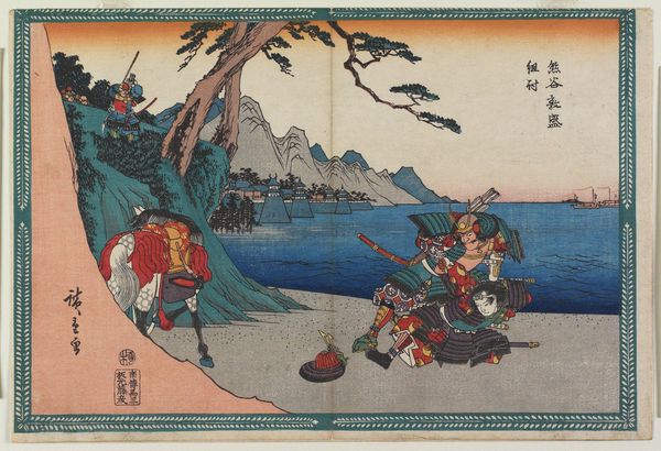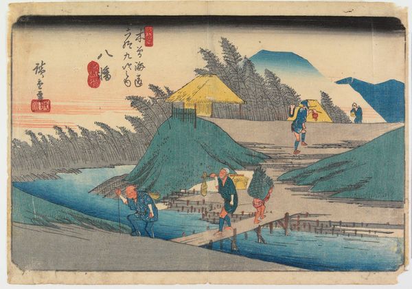 Editor: This is "No. 14" by Utagawa Hiroshige, created around 1835 to 1838. It's a woodblock print using ink. The composition feels really dynamic, even with such a serene landscape. What do you make of the figures depicted and the printmaking process used here? Curator: The woodblock print, particularly within the ukiyo-e tradition, really emphasizes the means of production. This wasn't solely Hiroshige's vision; it involved carvers, printers, and publishers, all contributing their labor. Consider the cheapness of ukiyo-e prints. They became a booming business serving everyday consumer habits in the city. The subject matter, too – these aren't noble figures but workers and travelers, people embedded in their daily lives along the Tōkaidō road. Look at how the material conditions made this art accessible to a wider audience, blurring the line between "high art" and a commodity. How do the travelers influence this piece, do you think? Editor: It's interesting to think about it as a commodity rather than a precious art object. I suppose their presence, especially the workers carrying goods, highlights the work and trade supporting the area. The travelers show consumption, which completes the commodification cycle of daily commerce. Curator: Precisely! And each step from the artist to carver to traveler consuming helps solidify not just the artistry, but all stages and work relationships and economic flow during the process that goes far beyond “just art”. How has thinking about this woodblock print in terms of production changed your perception? Editor: It makes me appreciate the layers of craft and labor involved, instead of just focusing on Hiroshige's individual genius. Curator: Exactly. And by understanding those material conditions, we gain a deeper appreciation for the art itself.