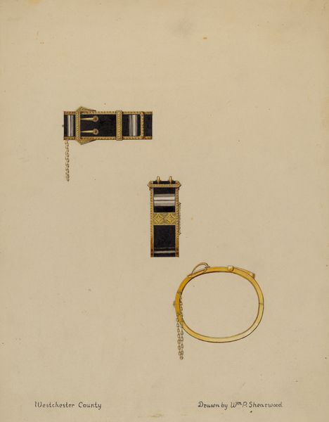 Curator: I'm struck immediately by the graphic nature of this work—almost like a technical drawing but rendered with such delicate washes of color. Editor: You've honed in on its appeal right away. This is Tulita Westfall's "Onyx Bracelet," created around 1937, using watercolor and colored pencil. It offers us a look at jewelry design from the late Art Deco period. Curator: The contrast between the honey-gold elements and the stark, rectangular onyx stones… it feels both elegant and somehow grounded, weighty even on paper. There's something potent about black stone juxtaposed with precious metals. Editor: That visual tension you’re picking up is definitely deliberate. Black onyx has long carried symbolic weight, thought to provide protection and grounding. Consider that in 1937, the world was still reeling from economic depression and edging towards another world war; these perceived properties in jewelry could bring peace to the wearer during uncertainty. Curator: That makes sense. Looking closer, I also notice that even the gold sections seem to be composed of repeated rectangular shapes, echoing the stones themselves. It speaks to a design sensibility deeply rooted in geometric forms, reminiscent of the architecture and design motifs prominent at the time. Editor: Absolutely. And you see these clean, hard-edged forms showing up everywhere during that period—furniture design, skyscrapers. This aesthetic found its way into fashion, which extended to jewellery. Pieces were no longer just adornments; they symbolized modernity, strength and resilience in a world of chaos. Curator: This design reflects a desire for control and order—a very interesting cultural commentary expressed through jewellery. Thinking about where a piece like this might have been worn brings another layer of context. I imagine it adorning women who, although restrained in certain social structures, were making their own place during that era. Editor: Precisely. When you consider the symbolism of onyx coupled with the bold geometric style, this “Onyx Bracelet” is not simply a fashion item. This piece really captures something essential about the 1930s and this particular time. Curator: Thank you for sharing this context; it deepens my appreciation for the artwork, viewing not only its beautiful lines and balance, but also its emotional strength.