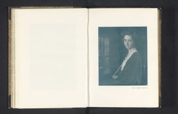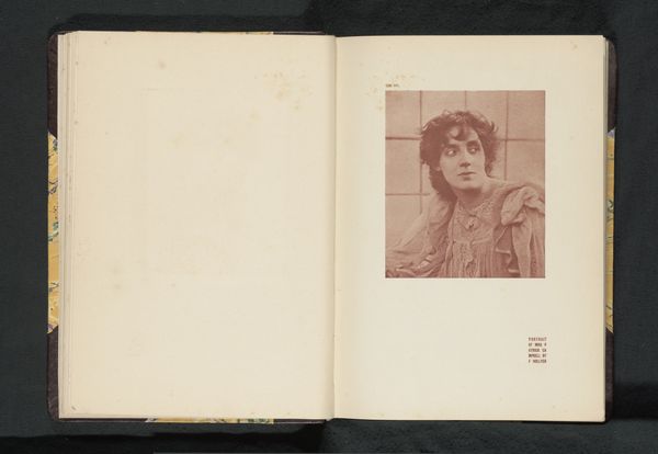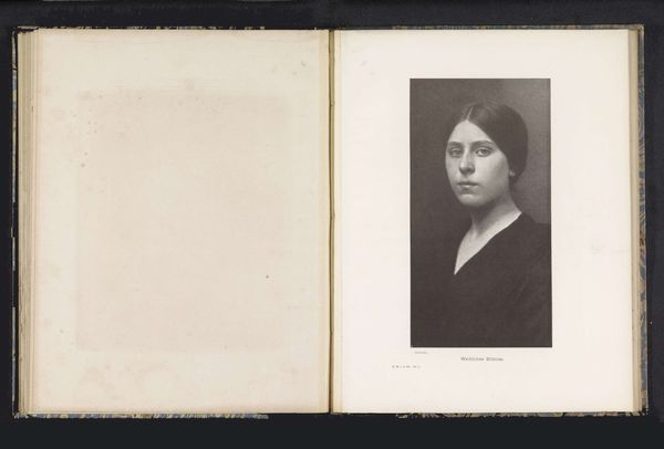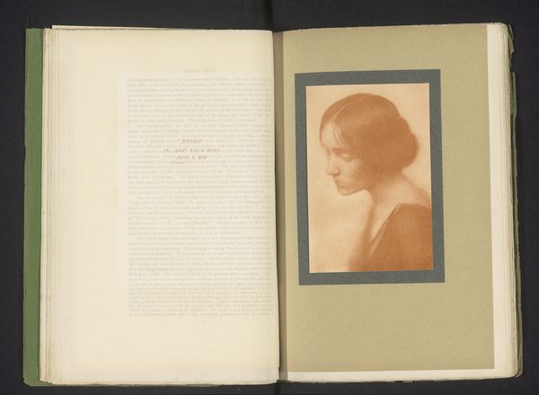 Editor: This is "Portrait of an Unknown Woman," taken before 1905, possibly by Will A. Cadby. It’s an albumen print, presented within the pages of what looks like a sketchbook. I’m really drawn to the aged paper and its texture. What strikes you about this particular piece? Curator: I’m immediately thinking about the material conditions of photographic production at the turn of the century. Albumen prints, for example, were commercially produced using egg whites. Think about the labor involved in producing the print and its social implications, who had access, how the mass consumption of photography affected perceptions. Editor: So, you’re saying we need to consider not just the image itself but also how it was physically created and consumed? Curator: Exactly. The choice of albumen impacts the image itself and creates value and a record. Furthermore, placing it in a book elevates it. I see a tension here between the intimacy of a sketchbook, potentially handmade paper even, and the commercially viable process of albumen printing. What kind of status does the book confer onto what might have otherwise just been a commercial print? Does this format challenge the mass-produced nature? Editor: That's a really interesting point. I was just focused on the aesthetic qualities of the photograph, like the soft focus and the vintage feel but what you point out suggests that the way in which the image was produced has meaning itself. Curator: Right. We could delve deeper, looking at things like who owned the sketchbook and what it tells us about their relationship to both artistic and photographic practices. Consider how this work challenges traditional art categories, blurring photography and “craft”. What have you learned from our discussion? Editor: That paying attention to materials, processes and presentation format can greatly broaden the interpretation of an image. Thanks! Curator: Indeed! Examining those qualities reveals fascinating questions about the photograph’s social context and value.