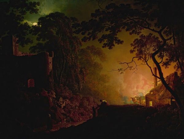 Curator: This is "Kæltringbal. Blicher ved taterhytten," painted by Hans Smidth in 1902. Editor: It's dark. Eerily so. Mostly blacks and deep browns, punctuated by this sliver of golden light leaking from what looks like a crude window. Curator: Yes, Smidth employs that tenebristic style beautifully, doesn't he? It creates this intense drama, drawing attention to the themes he’s exploring – societal outsiders, the romanticism of the marginalized… Think about the public reception; imagine exhibiting the life of nomadic people like this at the Statens Museum for Kunst. What statement does that make about the institution itself? Editor: Makes me think about labor. The artist’s labor of course—the patient build-up of dark layers. But even more, I am thinking of what physical exertion it took to construct that ramshackle hut that is implied beyond the small patch of illumination? Someone cut those trees, someone chinked the gaps in the timbers… It makes me wonder what are their modes of production beyond this structure that suggests meager materials. Curator: It’s interesting you highlight that. Smidth often depicted the lives of marginalized groups. He invites viewers to contemplate not just their living conditions, but the wider social forces at play. His own position within Danish society and the power dynamics inherent in observing and representing others comes into play. Editor: Do you think the dark palette reflects the limited available and affordable materials, that Smidth's own access as an artist played into the availability and thus execution of these dark moody landscapes, since it dictates, visually, who is on the outside literally and symbolically, but the fact the work even exists opens up possibilities about the inside. Curator: Certainly, those considerations contribute to the artwork's complexity, don’t they? This work challenges romantic notions about rural life. By confronting viewers with poverty and social inequality, Smidth’s realism is stark. He really engages the visual codes that challenge norms around beauty in his day. Editor: I see your point, it reminds me there's always material agency at play; Smidth's skill brings us to the intersection where choices – socio-economic, aesthetic, environmental, meet the limits of the pigments on his palette to tell a deeper story about both art and social standing. Curator: Indeed, the layers continue to unfurl upon closer observation, offering a richer, more nuanced understanding of the human condition and the role art plays in illuminating its hidden corners.