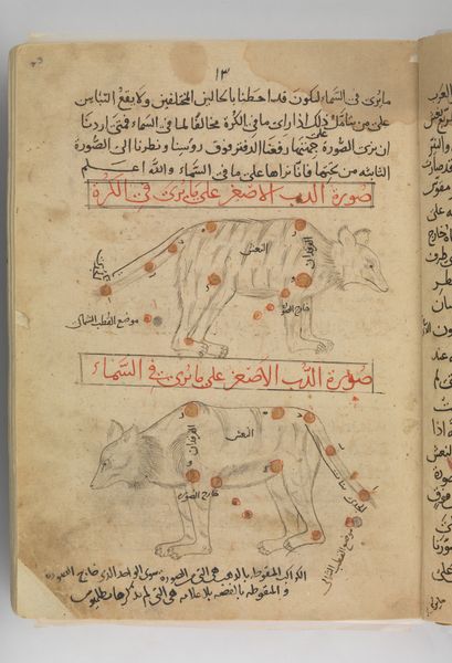 Curator: Here we see an image entitled “Figure for Use at Drinking Parties," created in 1206 by Al-Jazari. The medium used is watercolor and ink. What are your first impressions? Editor: It’s fascinating. At first glance, I’m struck by the almost diagrammatic quality – it’s like looking at a cross-section of a human automaton. The flatness of the image coupled with the apparent functionality, really engages my interest. Curator: Yes, the visual vocabulary blends art and engineering. Al-Jazari was renowned as a scholar, artist, and mechanical engineer. This miniature, typical of Islamic art, appears in his "Book of Knowledge of Ingenious Mechanical Devices.” The figure is indeed intended to dispense drinks at gatherings. It really underscores the period's unique fusion of science and artistic expression. Editor: Right, the visual economy of it. I mean, look at the way the body is represented not as flesh and blood but as interconnected vessels. The artist really focuses your attention to the labor inherent to the experience of drinking. What kind of material processes and craft were employed here, what sort of skills did it take? Curator: We need to also remember the societal role that books like this one played at the time. Its readership was limited to courtly elites who valued both erudition and amusement. These texts offered not just instruction manuals but were designed to display the patron's cultivated lifestyle. Editor: And it blurs boundaries, doesn’t it? High art used to represent social status and ingenuity. It prompts us to rethink our modern categorizations. It really forces one to question distinctions between design and so called fine art. Curator: Precisely. This image isn’t simply a decorative miniature. Its purpose reveals much about social life. I also want to underline its testament to a remarkable period where the pursuit of knowledge and artistry went hand in hand. Editor: Absolutely, reflecting on Al-Jazari's design illuminates that era, prompting to rethink how we engage with innovation, material application, and artmaking.