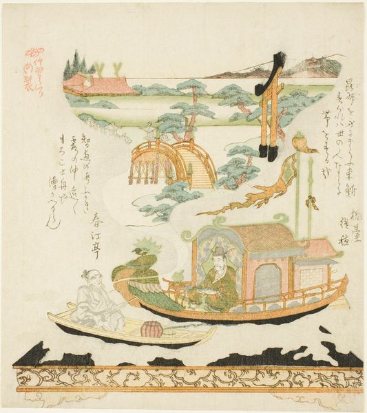 Editor: Ryūryūkyo Shinsai's woodblock print, "Jewel of the Full Tide (Manju), from the series "The Palace of the Dragon King (Ryugu)", created around 1820... There’s such a sense of serenity in the colors, but also a quiet, intriguing narrative. What do you see in this piece? Curator: Beyond its aesthetic appeal, it’s crucial to contextualize this Ukiyo-e print within the broader socio-political currents of 19th-century Japan. Notice the prominence of the floating structure. How might we interpret this lavish space as reflecting the elite’s detachment from the lives of ordinary people at that time? Who was invited into those spaces? Editor: That's an interesting point! I hadn’t thought about the space as exclusive. I was mostly focused on the calm ocean and the relaxing atmosphere with people enjoying themselves. Curator: And that escapism itself speaks volumes, doesn't it? The “floating world” of Ukiyo-e was a space where traditional hierarchies could be temporarily suspended, or even inverted, especially when you consider who made this work and the economic circumstances under which it was created and consumed. How did this aesthetic movement engage with or challenge prevailing power structures? Editor: So, while appearing calm and pretty, the artwork invites us to think about these subtle social critiques? To perhaps read between the lines of leisure and luxury? Curator: Precisely! Shinsai's work prompts a necessary interrogation of privilege and access. I also think it shows a nuanced view of cultural production. Editor: This really changes my perspective on the artwork. I appreciate the call to look beyond initial impressions, especially regarding its place in social context. Curator: Exactly! Considering art as a tool for either reinforcing or subverting societal norms opens new paths of thinking and awareness.