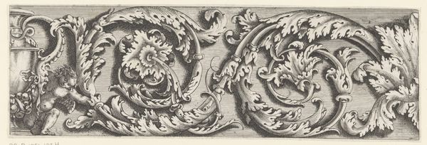 Curator: My eye is immediately drawn to the intricate detailing; the precision is remarkable! Editor: It's so ornate, almost dizzying. All that scrolling foliage makes my eyes dart around. This engraving from around 1640 is titled "Hoornen des overvloeds en vrouwenbuste," and you can find it here at the Rijksmuseum. Curator: Which translates to "Cornucopias and Female Bust." That title certainly sets the stage. What do you make of those horns of plenty? Editor: Well, cornucopias, as you know, are classic symbols of abundance and nourishment. But the way they're interwoven here, combined with that formal bust of a woman – possibly an allegorical figure – feels very deliberate. The artist, whose name, unfortunately, is lost to history, is making a clear statement. Curator: Yes, an abundance granted perhaps, or reflected by female virtue or authority? The way these visual elements are composed likely aimed to shape a particular idea of Dutch power and prosperity at a time of growing global trade. Engravings such as these were readily traded, influencing artisans across Europe and beyond. Editor: I'm fascinated by the stylized way the leaves and scrolls intertwine. It almost feels like peering into a dreamscape, full of swirling, evocative forms, each tendril seeming to vibrate with energy. Does the dynamism of the composition echo the turbulent times, do you think? Curator: Potentially, yes. There’s a certain restless energy that reflects not only the period's artistic sensibilities but also perhaps the broader societal currents, the Reformation’s emphasis on moralizing symbols or a shifting view of gender. What strikes me about this is how it collapses traditional symbolism into a decorative frieze, a style much needed for application across all social boundaries. Editor: Seeing it like that makes it all the richer. I’d been thinking of it in terms of personal aesthetic tastes; the swirling composition as an emblem of that baroque love of spectacle! Curator: And of status, absolutely. These flourishes become social language; and while individual craftsmanship mattered, context is just as central. This was never only decorative, nor only celebratory; it was also always saying something. Editor: Thank you. Thinking about its context makes the piece even more relevant to understanding not only artistic culture of the period but also its society more generally. Curator: Indeed, revealing just how much these symbolic representations were interwoven with socio-cultural codes of the era.