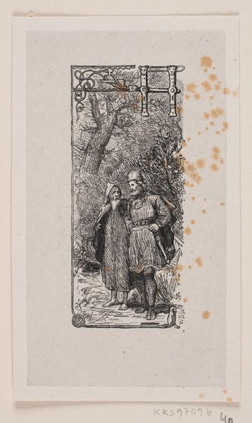 Eugène François de Block created this etching, "Two Figures Praying by a Cross in the Woods," with delicate lines that evoke a sense of solemnity and introspection. The figures are set against a dense backdrop of trees, their forms rendered with a soft, almost blurred quality. This creates an intimate and spiritual atmosphere. The composition is structured around the stark verticality of the cross, contrasting with the hunched, supplicating postures of the figures. The cross, as a sign, dominates the visual space, acting as the focal point for both the figures' devotion and our attention. De Block uses the etching technique to explore the interplay between light and shadow, which adds depth and a sense of mystery to the forest setting. The figures, rendered with empathy, engage in a ritual that signifies not only their personal faith but also perhaps a broader cultural narrative of repentance. The deliberate haziness of the scene may encourage us to question the boundaries between the physical and spiritual realms, inviting a contemplation of mortality and faith.