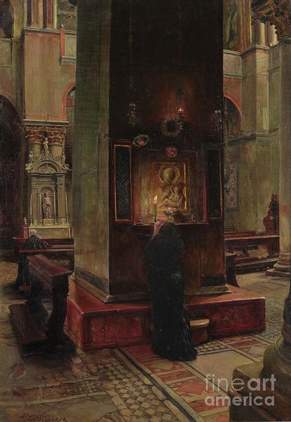 Ferdinand Hodler's painting, likely from 1895, captures a moment within the Cathedral of St. Pierre in Geneva, using oil on canvas. The composition presents a serene interior, dominated by vertical architectural elements and a stark contrast between the dark pulpit on the left and the softer, light-filled space behind the rows of pews. This contrast draws you in. Hodler employs a muted palette, focusing on grays, browns, and whites to convey the cathedral's solemn atmosphere. The brushstrokes are visible, lending the scene an immediacy, blurring the distinction between realism and subjective experience. Hodler's interest in capturing the 'spiritual' through form is evident. The semiotic interplay here is fascinating: the pulpit, a symbol of authority and discourse, faces a congregation, hinting at a dialogue between the divine and the earthly. But the ethereal light and simplified forms suggest a move away from traditional religious iconography toward a more abstract, personal interpretation of faith. It emphasizes how Hodler destabilizes conventional representation through structural elements.