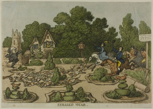 James Gillray created this hand-colored etching titled ‘Hounds Finding’ at the turn of the 19th century. Known for his satirical prints, Gillray skewered the elites of British society, often focusing on political figures and social trends. In this print, we see the chaos of a fox hunt, a popular pastime among the aristocracy. A rider has fallen, quite literally arse over teakettle, while the hounds swarm around him, and other riders continue on. Gillray, with his keen eye for detail, captures the absurdity and potential cruelty of the sport, poking fun at the privileged class and their pursuits. It's hard not to laugh at the misfortune of the fallen rider, his wig askew and his face contorted in shock. Prints like these were widely circulated and consumed, making Gillray a powerful commentator on the social and political landscape of his time. He held a mirror up to society, reflecting its follies and excesses with wit and sharp observation.