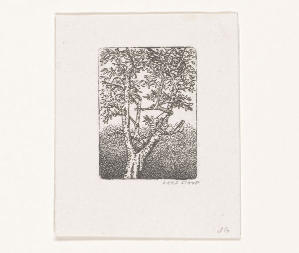 Curator: Welcome. We're looking at Julie de Graag's "Besneeuwde lijsterbes," created in 1918. It’s a lovely ink drawing on paper currently held at the Rijksmuseum. Editor: A snowy rowan tree indeed! It gives me such a serene feeling. The geometry is softened just enough with those bare branches and weighty snow-laden limbs. Curator: Let’s think about De Graag’s method. The piece demonstrates precision through line work with a minimalist color palette. Consider the type of paper used. The way ink settles is key to that soft grayscale tone. This artwork reflects a conscious choice to value craft during times of social shifts in artistic value. Editor: That limited palette definitely serves a purpose, beyond pure materiality. Gray, black, and white lend a starkness, appropriate for January. The Rowan tree itself—traditionally, a powerful symbol of protection. Winter strips away pretense, showing what is elemental and essential. Curator: Precisely. Think about it as a meditation on stark, simple means of survival represented within her constrained artistry during a World War I backdrop, focusing on the basic materials available, thus commenting on societal and aesthetic restraints. Editor: It strikes me that while austere in palette, it isn't bleak. Those curved branches suggest a quiet optimism, almost a cyclical promise, appropriate for imagery to be put together to represent “January”. In what ways are geometric design principles incorporated for iconographic meaning here? Curator: I see her simplification not just as design, but in terms of a production-based need for streamlined work, perhaps influencing the flattened perspectives in her printmaking as an act of necessity due to a changing socio-economic artistic world, that gives off strong visual messages in tandem. Editor: Very interesting point. The geometric style does also highlight that underlying structure, a hidden order to things—revealing underlying connections—much like winter revealing the bare bones of the landscape, thus becoming less ornamental. Curator: It reminds us that our art viewing experience changes as we analyze creation within contexts like limited means of distribution of information—perhaps a way she worked against wartime challenges. Editor: De Graag captures that intersection beautifully. This piece, beyond its tangible being, communicates ideas and perhaps something deeper in how it represents time itself through layered imagery. Curator: I agree that the work does transcend a straightforward interpretation, reflecting De Graag's material conditions to address timeless human themes, expressed in a beautifully simple artistic execution that creates powerful messaging.