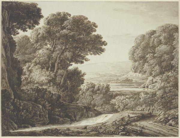 Curator: Standing here, we're observing "Le Soir des Bergers," or "The Shepherd's Evening," an engraving produced around 1828. It resides here at the SMK, the National Gallery of Denmark. Editor: The immediate impression is serenity. Despite being monochromatic, it’s intensely detailed. There’s a deep sense of perspective, a layering that invites the eye into a landscape pregnant with calm. Curator: That sense of perspective is central to Romantic landscapes. We see here a very strong composition employing established tropes of the period. There's the obvious interest in nature, but consider how such works served a burgeoning art market during a time of immense political upheaval in Europe. Editor: Yes, landscapes at this time weren’t neutral; they evoked identity and ownership of place during rapid urbanization. Who does this idealized scene really represent? It’s easy to see this work romanticizing pastoral life, perhaps at the expense of truly exploring the social realities that existed for agrarian communities. Curator: You raise an excellent point. Consider, though, that idealized images also shaped public discourse, sparking interest in and perhaps even concern for the rural poor within evolving political structures. These works were readily distributed via print, creating visual economies centered around concepts of nationhood and belonging. Editor: While dissemination broadens access, let's not dismiss the selective narratives reinforced here. The engraving technique, though skillful, also carries a level of distance and detachment, filtering direct emotional response, obscuring the hardships faced by the working classes that often worked under brutal feudal structures. The reality of their existence is glazed by beauty. Curator: I agree, that's crucial to remember. There’s definitely an interplay here between an attempt to create something artistically sublime and simultaneously conveying a socio-political message, intentional or not. Editor: Absolutely. This piece can show how aesthetics and politics were, and continue to be, closely entwined. It provokes us to consider whose stories get told and how these choices affect perception, not just in art history, but also contemporarily.