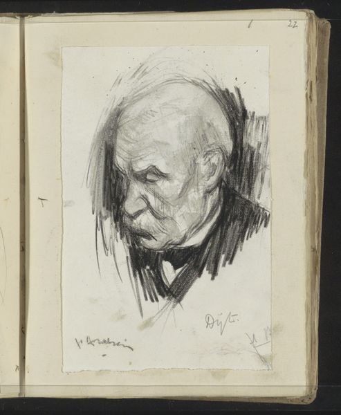 Curator: Max Beckmann rendered this pencil drawing, "Bildnis Georg Swarzenski," in 1950. It's currently housed here at the Städel Museum. Editor: It has the appearance of something quite rapid, an efficient study in tones using just pencil on blue toned paper, as if executed in a moment stolen from more demanding work. The face has such immediacy. Curator: Georg Swarzenski, whom Beckmann depicted here, held the position of director at the Städel Museum during an extremely pivotal period, specifically during the Nazi era and directly following it. We might consider how this sketch negotiates issues of cultural authority and even the recuperation of German identity. Editor: Interesting you should mention that, I immediately consider the materiality; the specific choice of materials is revealing: simple graphite on toned paper. This evokes a sense of modesty in materials that would have certainly have been chosen as part of a careful budget at that time. The work appears as a type of record-keeping, almost journalistic, as he navigates a new relationship of cultural governance within his artistic process. Curator: Absolutely. One could argue Beckmann’s choice in medium directly opposes grander, more pompous styles favored by the Third Reich, quietly defying ideological impositions through aesthetic choices. The stark simplicity lends to it a subversive edge within that socio-political climate. Editor: I notice the paper's light-blue tone as functioning to unite all, literally working with what’s to hand while maintaining careful observations throughout the making, and considering the production—or how this work circulates amongst different socioeconomic classes. Curator: In looking at Georg Swarzenski’s slightly downcast eyes, perhaps mirroring the state of the post-war cultural landscape, we witness how deeply implicated individual identity becomes in the project of national rebuilding and remembering. It serves as a very human-scaled reckoning. Editor: Right, but to add to this I feel that Beckmann’s gestural and yet economic pencil work shows an efficiency for making, and the way that the work shows his hand reveals that there’s labour and work embedded and on display. Curator: This all prompts us to reassess traditional hierarchies that separate the conceptual and the manual. Editor: The artist’s own identity and intention of this work still manages to become embedded. Overall, Beckmann gives us not just a depiction but an entry point into a deeper discourse.