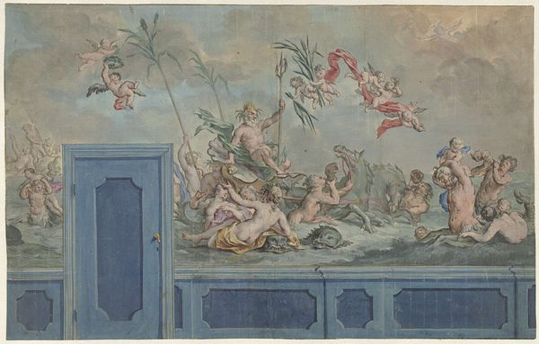 Editor: This is "Couple by a Fountain," a late 18th-century watercolor and drawing by Hubert Robert. It depicts a scene of leisure with a woman reclining as a child playfully diverts water from a fountain. I’m curious to know, what story do you think this image is trying to tell? Curator: I wouldn't be too concerned with a specific 'story'. Rather, I consider the image as evidence of the Rococo era's preoccupation with leisurely pursuits. Observe how the artist's handling of watercolor gives the entire scene a delicate, almost ephemeral quality, yet these are affluent people who are afforded time to sit about as laborers carry jugs. What does this visual economy signify for you? Editor: It makes me think about the privilege required to engage in such idleness. It contrasts with, say, the very real work of a servant carrying jugs of water, or of the artist creating this pretty fantasy. I hadn't thought about it like that. Curator: Exactly. We must not only celebrate this image as something aesthetically pleasing but investigate the power dynamics implicit in Robert's artistic project. By depicting leisurely fantasies and painting romantic scenes, it also raises questions regarding artistic labor, its intended consumer and cultural production. Where might these materials have come from? How might an object like this, itself seemingly light and decorative, engage with the burgeoning ideas around commerce, social stratification, and leisure of the period? Editor: So, rather than seeing a simple scene of people enjoying themselves, we should also examine the broader implications regarding the production of this artwork. Curator: Precisely. This watercolor then becomes a window into understanding 18th-century class structure. And don’t you think these observations offer a far more complete perspective on Robert's intentions?