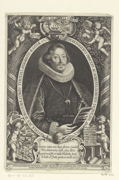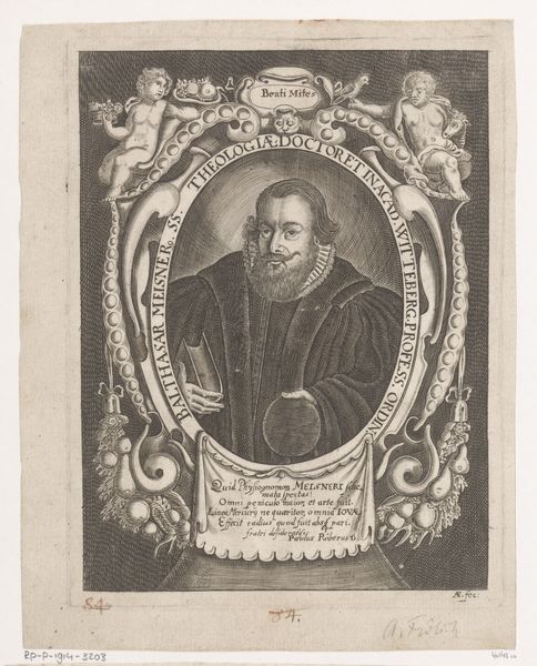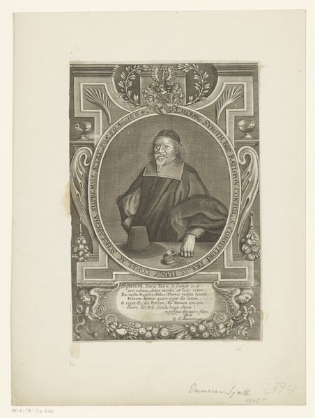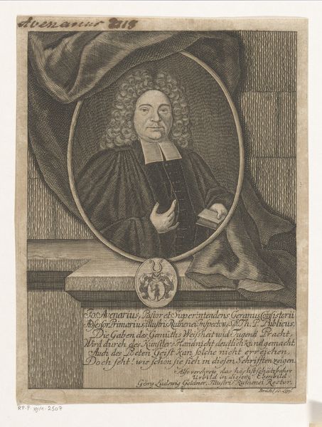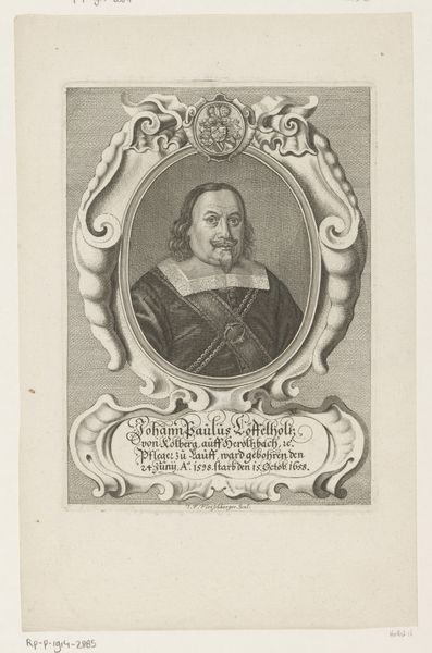 Curator: Gazing upon this image, one feels immediately drawn into a quietude, a certain pensive quality. Editor: Indeed, and that might come from the expert manipulation of the materials here. What are we looking at exactly? Curator: This is a print, specifically an engraving, known as "Portret van Wolfgang Göpner," created sometime between 1667 and 1720. It comes to us courtesy of Johann Alexander Böner and currently resides in the Rijksmuseum collection. Editor: Böner. You see the immense labor and technical skill, particularly with those fine lines etched into the copper. But all for what? The print trade commodifies reputation. Gӧpner would've distributed these to enhance his status. Curator: Well, to our eyes, yes. However, I find the subject of the portrait captivating. The eyes seem so heavy with something unnamable. Doesn’t it prompt questions about him, his life? Editor: Sure, but the questions always circle back to production and circulation. Think of the resources expended, the societal structure allowing this form of portraiture to thrive. The paper itself... Curator: And the collar! It is absurdly wonderful, a physical manifestation of formality— almost comical when you really look at it. I see the sitter's face and I have to stifle a giggle. Editor: He's literally framed. Think about the societal framework supporting that gesture! I look beyond the figure and to the larger world, the systems of patronage and value. How was his likeness used, traded, consumed? Curator: Yet I wonder, did Gӧpner choose to present himself in this very way? Does he recognize a trace of himself when the piece went into production? It speaks of an awareness and a relationship to the work, both literally, artist to model, but beyond it also. Editor: Perhaps. And looking again now, knowing how this print served its function within a structured market economy... that lends a new weight, no? Thanks, as always. Curator: Always a pleasure to unveil new thoughts.
