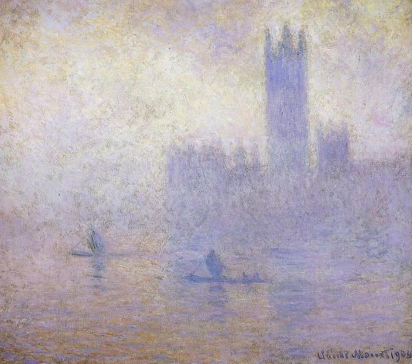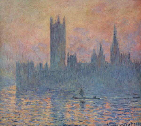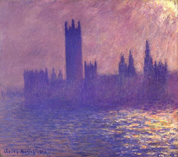 Curator: There's something undeniably melancholic about this canvas; it’s almost entirely shrouded in blues and purples. What do you see when you look at Monet’s "Houses of Parliament, London," painted around 1900? Editor: I see a symbolic blurring, almost an intentional obfuscation of power. Parliament, normally a stark, imposing symbol of British authority, dissolves into atmospheric haze. It's fascinating how the institution becomes ethereal, questioned even. Curator: Indeed. Monet wasn't necessarily after political commentary; more likely, he chased a specific atmospheric effect on the Thames. He rented rooms overlooking the river specifically to capture these fleeting moments. The constant re-visiting of images mirrors the constant changes in what you can observe, as light and color change. There are many works that show these same views. Editor: That makes sense. Monet seemed determined to portray these buildings dissolving and reforming with light. How do you interpret his obsession with representing architecture that was also a political centre? Curator: For Monet, Parliament might have been secondary to what it represented as a silhouette: enduring, but also ephemeral against the elements. There’s a romantic quality in finding visual permanence within such transience. We're projecting an aura on a specific type of stone and constructed skyline. What associations does it hold, that makes the heart ache, even in it's partially hidden view? Editor: I think there is a conscious visual choice. Parliament is there, just on the verge of dissolving, representing the shifting societal and political currents that modernity introduces. He captures a specific moment in time, just before all certainties went out of the window with the First World War and Modernity hit its stride. Curator: The blurring and blending becomes a powerful visual metaphor, then, for historical change, doesn’t it? It allows viewers to project anxieties onto a shared cultural icon. A sign that is both enduring and changing. Editor: Exactly. Even a seemingly apolitical approach opens up complex readings. Ultimately, it becomes less about the architectural accuracy, and more about using familiar visual vocabulary to reflect the weight of a changing era. Curator: Precisely, and by focusing on atmospheric impressions, Monet captures something much deeper about collective anxieties, maybe even unintentionally, but undoubtedly, perceptively.