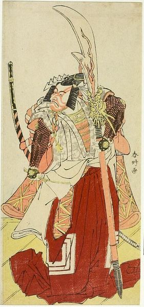 Curator: Katsukawa Shunko's print depicts actor Otani Hiroji as a servant on horseback. Its graphic economy and compressed pictorial space are compelling. Editor: He looks utterly bored stiff, doesn't he? I get the feeling he'd rather be anywhere else but on that poor red horse. Curator: The actor’s weary posture and facial expression certainly convey a sense of ennui. Note how the artist has used line and flat planes of color to define form and space. Editor: Even the horse seems to have adopted the same "I can't be bothered" pose. The composition, with its vertical emphasis, really adds to that sense of weary downward pull. Curator: A fascinating interplay of figuration and abstraction. I appreciate the visual system at play, while you connect with the palpable sense of weariness it evokes. Editor: Exactly. It reminds me that sometimes, even in art, feeling is everything.