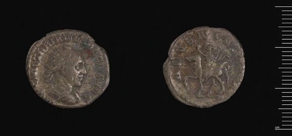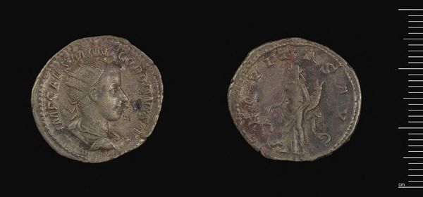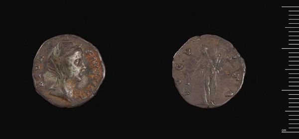 Curator: This is a denarius of Septimius Severus, currently residing in the Harvard Art Museums. Editor: It looks…well, like a very old coin. Worn, maybe a little sad, but with an echo of importance. Curator: Indeed. Minted to legitimize Severus's reign after a period of civil war, the coin served as a crucial form of propaganda. The imagery, while worn, projects power and authority. Editor: So, it's like a tiny, pocket-sized power statement. I wonder who held it, what hands it passed through. Did they ever imagine it would end up here? Curator: It's a fascinating question to consider. As material culture, the denarius not only reflects the political climate of the Severan dynasty, but invites us to reflect on the social and economic narratives that shaped its circulation. Editor: I guess even small change can carry a heavy history. It makes you think.