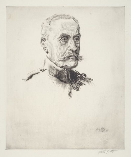 Editor: Here we have Walter Tittle's portrait of "Monsieur Rene Viviani, Former Premier of France," created in 1921, using graphite or charcoal, I believe. The man's gaze is rather intense, and the medium seems to capture every line on his face. What do you make of it? Curator: I'm immediately struck by the *process* here. Consider the materiality of graphite itself – a mineral, extracted, processed into a tool. Tittle uses that tool to portray a man, yes, but it’s also a physical record of labor. We see the artist's hand, the pressure applied, the accumulation of graphite on paper. Editor: So you’re saying the portrait is not just about Viviani, but also about Tittle's act of making? Curator: Precisely. Look at the unfinished quality below the suit. It exposes the working methods, the "raw materials," if you will. In that sense, isn't the image also about *reproducing* images, making this one potentially infinitely reproducible using techniques such as printmaking. This moves the artistic merit from concept and into tangible goods that can be bought and sold. And, we shouldn’t forget that this portrait depicts a *former* premier – a man defined by his labor within a specific political-economic structure. His "value" is shifting, subject to change. Editor: That’s a completely different way of seeing it! It’s almost like a document of industrial techniques. I hadn’t considered the socio-economic aspects of portraiture, especially with someone who held public office. Curator: It shifts our attention from the individual to the structures of power that shaped him, and how that is then materially expressed. The medium and how it is produced speak volumes. Editor: I'll never look at a simple portrait the same way again. I’ll definitely pay more attention to not just who, but *how* something was made, and *why*.