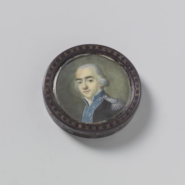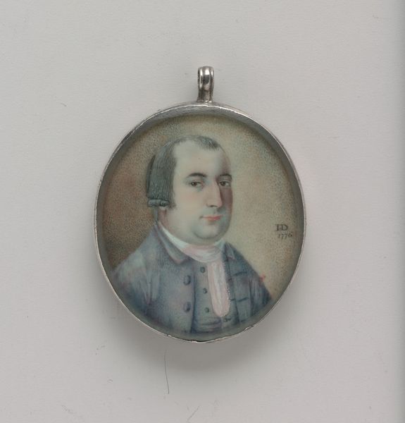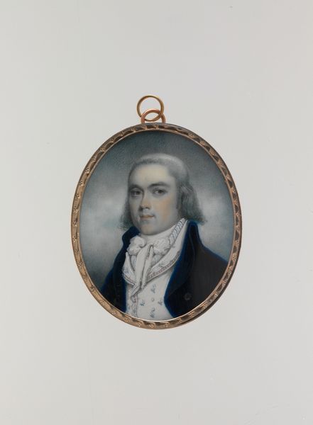 Curator: This watercolor and colored pencil miniature, created around 1794, presents a portrait of Ebenezer Mack. Editor: My first thought is just how intimate the scale makes it feel. Almost like a secret kept close, maybe worn as a locket? Curator: Exactly! The format lends itself to personal connection. Notice how the composition focuses nearly entirely on the figure, tightly framed in an oval. The palette is quite constrained, favoring muted blues, yellows, and browns. How do those hues function, visually? Editor: Well, blue often represents loyalty and steadfastness, fitting perhaps for the early republic. Yellow's associations with intellect could also be intended to project enlightenment values. Curator: It’s also worth pointing out that this work resides squarely within the Neoclassical art movement, even if its subject is somewhat…plainly presented. Editor: But there is something inherently striking. That tight frame you mentioned amplifies this effect. The artist used colors very purposefully. We tend to see a rise in such detailed portraiture, because what would typically happen at monumental size is reduced to a tiny keepsake. We assign new cultural significance to those depictions when we change their scale. Curator: I'd agree. Moreover, his posture—rigid, forward-facing—lends an almost severe tone, typical of the period's embrace of reason and order. The details of his ruffled jabot and coat are meticulously rendered, pointing towards the value placed on decorum. It presents the codes that make identity and meaning within this moment. Editor: It truly does act as a powerful encapsulation of its historical context, scaled to be worn. Pondering that, I suppose it speaks of our innate urge to immortalize those we value and admire. Curator: Yes. Considering it with fresh eyes gives us, I think, more respect and clarity. It shows that beneath all those stylistic changes that every single generation undertakes to change the art world—fundamentally—what it stands for changes imperceptibly.