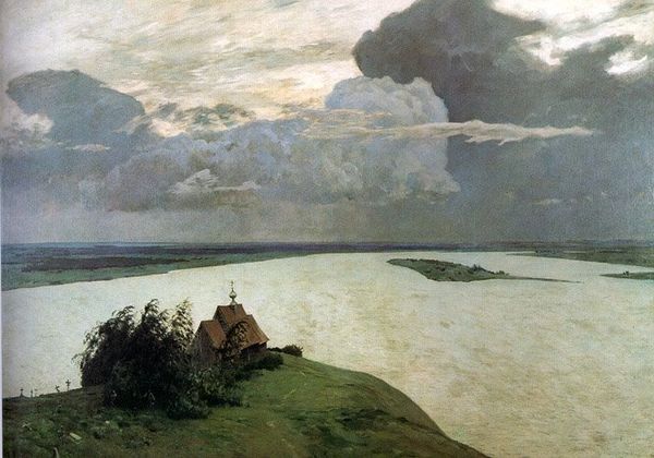 Curator: Vasily Polenov painted this small, serene landscape, “Chapel on the Banks of the Oka,” in 1893. It appears to be oil on canvas. The work has a quiet feel. What are your initial impressions? Editor: It feels melancholic. The colours are muted, the river calm. Even though it's bright, there's a stillness, a solemn quality given to the place and the building. It feels like a lost world. Curator: I notice the materiality and how it intersects with Polenov’s context. Oil paint allowed for this level of atmospheric depiction, but also for a degree of precision in representing textures: the wooden logs of the chapel, the different kinds of green of the foliage. It is really detailed and the impressionist style helps evoke a palpable sense of rural Russia in the late 19th century, highlighting a connection with nature. Editor: The chapel as a central motif definitely plays a symbolic role. Churches and chapels in art represent more than just religious buildings, frequently acting as symbols of stability, cultural identity, and tradition. Their placement within the natural landscape emphasizes humanity’s relationship with nature. Curator: Agreed. The artist emphasizes the hand-made structure and uses impasto to bring texture. It draws our attention to how Polenov is deliberately foregrounding the role of building, constructing this particular cultural identity and historical perspective. What is really catching my eye is how he juxtaposes traditional methods with the industrial revolution era in Russia. Editor: And think of the golden dome and cross. Even in muted tones, that little flash signifies spiritual authority, faith, tradition, all things eternal. Set against the changing seasons, that image suggests resilience and timelessness. The work reminds us of our innate need to connect to something greater. Curator: The work really does allow you to understand something about the artist's own values and investment, not to mention the physical act of constructing the image through careful brushwork and layers. The painting as a historical document almost. Editor: A humble document maybe, but one resonant with feeling, reflecting on a nation’s cultural spirit through its most enduring symbols. Curator: Absolutely, viewing art with both lenses provides such an enriching understanding. Thank you.
