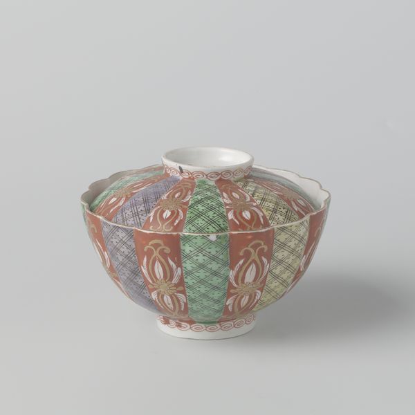 Curator: At first glance, there's an appealing symmetry and an unusual colour palette that grab the eye. Editor: Today, we’re looking at a piece by Theo Colenbrander from around 1925, a ceramic earthenware pot, playfully titled, "Bak van aardewerk, versierd met gestileerde bloemmotieven," or "Pot of earthenware, decorated with stylized floral motifs." Curator: Stylized is key here! We aren't looking at botanical realism, but something leaning more toward a decorative patterning of natural forms. It gives me a feel of something almost ancient and otherworldly. Editor: Indeed, the way those almost tribal-like forms intersect also suggests themes of transformation, but perhaps also how colonialist tendencies were used in what was considered to be exotic or novel at the time. Think about how non-Western art traditions inspired the art of that time in ways that erased important aspects of what their original symbols may have been. Curator: That makes me consider the continuity of symbolic representation. I look at those geometric patterns and immediately think of the long history of earthenware – how the shape itself and even the medium—connects us to ancient crafting practices. The patterns feel familiar, almost primal. I see this reaching towards something buried deep in collective memory, across cultures. Editor: Do you think those colours amplify that, despite the more traditional, romantic, often gendered associations around floral patterns in the home space, a challenge to those stereotypes perhaps? I can't help seeing the red accents of power juxtaposed with those less vivid tones of a certain muted oppression that affected social issues. Curator: Interesting point. These juxtapositions work. The muted tones don't lessen the vibrancy, the red trim pops out without overshadowing the earthiness of the ceramic base. This earthenware echoes something timeless...an object out of place, both futuristic and ancient. Editor: Ultimately, it speaks to the dynamic tension between decorative artistry and cultural messaging, as something almost universal emerges from this dialogue between pattern and intent, tradition and rebellion, creating something complex and intriguing for today’s audience to appreciate. Curator: A simple object that sparks so much—a little pot bursting with significance!