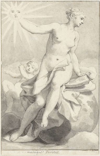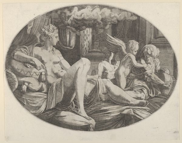 Editor: This is "Jupiter and Danaë," an engraving made around 1610 by Jacob Matham, now residing in the Rijksmuseum. There's something striking about the composition; Danaë is depicted in repose as coins rain down upon her. How do you interpret the formal elements at play here? Curator: Let's begin with line quality. Notice the sharp, precise lines that define Danaë's form. Consider, also, the strategic use of hatching to create shadow and volume. Where does Matham successfully create depth and realism? Editor: I notice the heavy shadows around Danaë's face, and in the folds of the fabric. But also, how the falling coins seem almost flat against that depth. Is this intentional? Curator: Precisely. Matham has deployed chiaroscuro to enhance the sensual texture of Danaë's flesh while flattening certain elements such as the coins, underscoring the symbolic weight of that golden downpour. It transforms physical form to divine intervention. Notice the drapery above and to the left - it echoes the subject in the lower part of the composition in a visually arresting way. Editor: So the stark contrast in the print serves a dual purpose, emphasizing the physical while also alluding to something beyond? Curator: Indeed. Through a sophisticated arrangement of visual elements, Matham achieves both textural richness and symbolic depth within the limitations of engraving. Editor: That makes so much more sense. Thank you for clarifying the visual strategies behind the piece. Curator: My pleasure. Reflecting on it, I find that I am particularly intrigued by how Matham makes full use of contrast, and light, to communicate what lies at the heart of the matter.