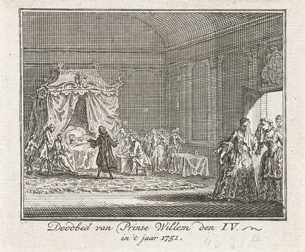 Editor: This is "Sterfbed van Frederik Hendrik, 1647," made between 1782 and 1784 by Simon Fokke. It’s an engraving currently housed in the Rijksmuseum. Looking at this print, the dense, cross-hatched lines creating light and shadow, and it feels incredibly formal and a little melancholic. How do you interpret this work? Curator: As a materialist, I see this print as a product of a specific historical and social context. It's crucial to understand the means of its production. Engraving, a reproductive technology, democratized images, making them accessible to a wider audience. But who truly benefited from this accessibility? Editor: What do you mean? Curator: The process of engraving itself – the labor, the skill required – highlights the socio-economic dimensions of art production. This wasn’t a unique masterpiece; it was created to be circulated, consumed. Who were the intended consumers? And how did the image function within the larger network of power and patronage? Think about the story it tells - the death of a powerful figure, rendered for consumption. Is it celebrating or critiquing? Editor: I hadn't considered the production process so deeply. The "democratization" aspect is interesting – the idea of accessibility versus the actual audience. So, it is as much about labor and its socio-economic factors of printmaking at the time, as about what the scene depicts? Curator: Exactly. This print isn’t just a representation of an event; it’s an object embedded in a web of social and economic relationships. Consider also, the engraver himself and what purpose the final material, the print itself, has and who benefits from the act of creation, both literally and figuratively. Editor: That provides a whole new perspective. Seeing it as an object shaped by these factors opens it up to so much more scrutiny than just what it shows at face value. Thank you! Curator: Absolutely. Material analysis always invites deeper understanding.