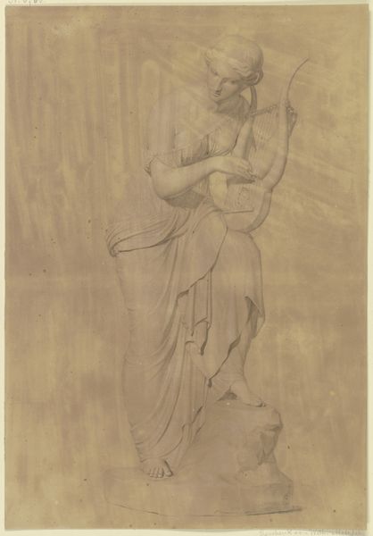Curator: This striking photograph presents us with a rendition of the Winged Victory of Samothrace, also known as Victoire de Samothrace. Though this print is estimated to have been produced in the 1860s, the sculpture it depicts comes to us from ancient Greece. Editor: The angle of the photograph is compelling. The draped fabric almost has more prominence in this version, accentuating its intricate carvings. Even though it is not as complete as other sculptures from antiquity, I am drawn to how it embodies ethereal, upward movement. Curator: This image belongs to an era of increased accessibility and distribution. Before mass tourism, photography allowed far wider audiences to encounter major works like this one. Consider the layers involved—quarrying the marble, sculpting the original Nike perhaps to commemorate a naval victory, then the laborious creation of this image to spread the work further. Editor: Yes, and observe the deliberate use of light and shadow here. The drapery clinging to her form accentuates the form and tension, offering dynamism as it captures the effect of the wind. Even without the sculpture's original setting and context, the artist still manages to elicit power in this single image. Curator: It's fascinating to ponder the social functions of this object—both in antiquity and during the era when this photograph was created. It functioned as propaganda, certainly, perhaps celebrating power in a young country struggling with its national identity. The consumption of classical imagery at this time says quite a lot about aspirations to be taken seriously on the world stage. Editor: Precisely. It reminds us that visual art can move and thrill without replicating realism. Abstraction in presentation offers its own path to appreciation. Curator: The means by which these historical artworks achieve such continued resonance truly makes you appreciate the process behind not only the piece itself, but also how these types of images come to have so much weight. Editor: Indeed. Analyzing its visual structure opens us up to different ways of understanding culture, context, and history, reminding us of the sculpture’s inherent aesthetic brilliance.