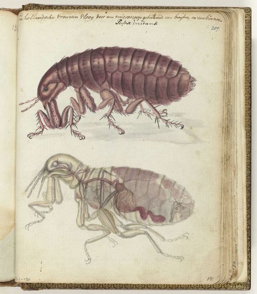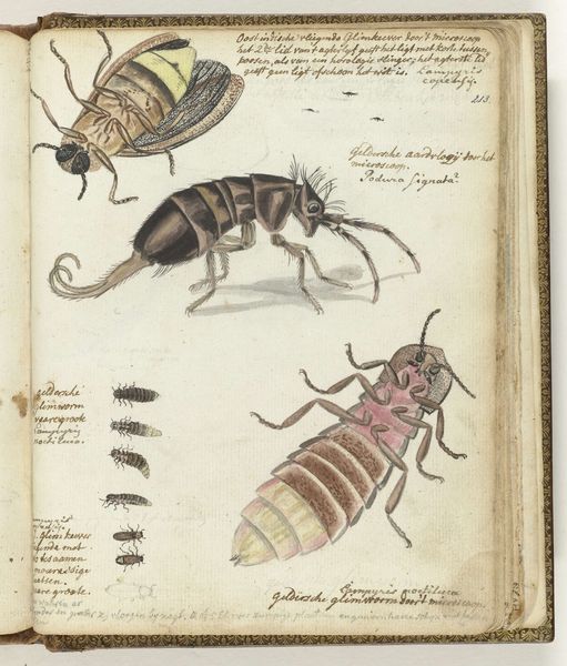 Curator: I'm drawn to this page of insect studies, "Insecten," possibly created around 1783 by Jan Brandes, rendered meticulously with coloured pencil on paper. It's quite a curious collection. Editor: They do feel curiously alien and yet meticulously observed. I notice that the paper has a yellowish tinge from age and what look like quick handwritten notes around each insect specimen. The starkly rendered insects against that aged parchment feels, I don’t know…a bit ominous. Curator: Ominous? Well, Brandes was traveling quite extensively for the Dutch East India Company, documenting flora and fauna, perhaps for scientific or even commercial interests. There is that precision that certainly implies close scrutiny of these organisms' structures and how those forms would benefit industry. Editor: Absolutely. It makes me consider the actual labour. The cost, so to speak. Consider the procurement of these insects, the preparation of pigments, the expense and transport of the paper and coloured pencils; that time spent meticulously capturing each body… what social hierarchies allowed for such an activity? It’s clearly part of a much larger system of resource extraction. Curator: You make a good point. Perhaps "ominous" is another way to describe how naturalism aestheticizes processes of colonization and resource exploitation. Still, it’s difficult not to admire the delicate rendering of these creatures. See how he’s captured the iridescent sheen on what appears to be the wing of a weevil, and the segmented body of the caterpillar emerging from its chrysalis, it’s beautifully done. Almost reverential in a strange way, I think. Editor: True, and I think that contrast, between aesthetic beauty and extractive process, holds so much tension. What's more interesting is this strange intimacy with what we often deem "pests." There's an acceptance that's, I think, both revolutionary and a clear indicator of a very different system of ethics from our own. Curator: Well, looking closer, there's something oddly delightful and insightful about encountering these insects, frozen as they are. These were the actual wonders that Brandes encountered! Thanks for pointing out that productive friction. Editor: Yes! The work has really changed from first impression. Brandes offers such insights through his specimens, that they still resonate centuries later is remarkable.
