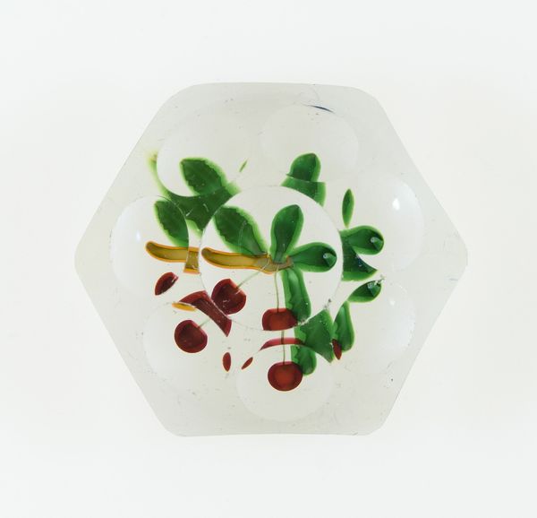 Curator: What immediately strikes me is its almost meditative quality—like a perfectly still, contained garden. It's deceptively simple. Editor: We're looking at a glass paperweight, probably crafted by Baccarat Glassworks between 1845 and 1860, currently residing at the Art Institute of Chicago. It’s decorative art at its finest, blending form and function. Curator: Function, yes, but its primary appeal, to me, comes from its almost sacred geometry. Those carefully arranged floral motifs—there's something deeply symbolic, almost heraldic, about them. Each flower type and color could have specific meanings tied to Victorian floral language. Editor: Right, those jewel-toned pansies – symbols of remembrance, perhaps? And the central white blossom—a symbol of purity or even death when surrounded by the deeper hues? You start thinking of Vanitas paintings of the Dutch Golden Age: here today, gone tomorrow, but frozen for all time in a single artwork. Curator: Precisely! And encased in glass like this it adds a protective layer almost to sanctify a certain image in one’s life, giving us clues of what might’ve been the collective imagination of the artist as well as of the audience of these Baroque inspired items during the Victorian era. It is not necessarily about life's decay, but rather its persistent, hopeful essence. Editor: Absolutely. Glass itself, being fragile yet enduring, becomes part of that visual message. The weight grounds those delicate ideas, anchoring them in the everyday. Curator: You get this perfect balance between the tangible and the ethereal, a dance between beauty and melancholy and permanence in an object designed for simple, everyday use. What a subtle way to communicate complex emotion! Editor: It reminds me how, in a way, it is an echo of how art objects create the very feelings they evoke in the human observer through the use of color, imagery, materials, technique and texture in perfect synchronicity. I want to grab this time-stopping microcosm in the palm of my hand, forever.