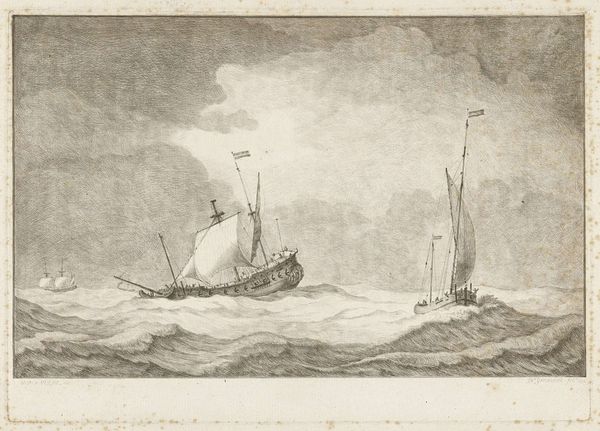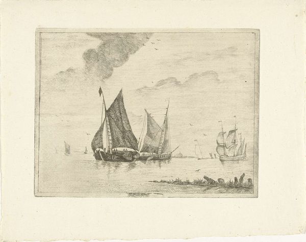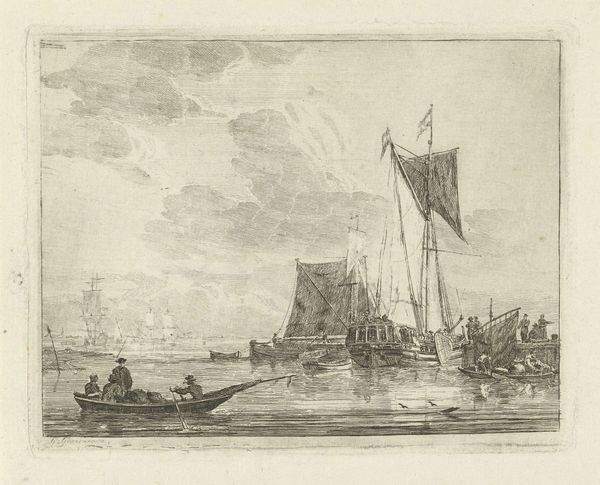 Johannes van Hiltrop's etching presents a serene river view populated by sailboats and a small skiff. The image evokes the Dutch Republic's deep connection to its waterways, which were vital arteries for trade and communication. Produced during a time of political and economic transition, this work reflects both the enduring importance of maritime activity and perhaps a longing for a bygone era. The presence of a church in the distance signifies the role of religion in Dutch society and its presence in the landscape. The etching technique itself, with its fine lines and attention to detail, was a favored medium for disseminating images and ideas among a growing literate public. To understand this work more fully, one might delve into the history of Dutch printmaking, the economic conditions of the time, and the role of landscape in shaping national identity. Art history invites this kind of interdisciplinary investigation, enriching our appreciation of art as a product of specific social and institutional forces.