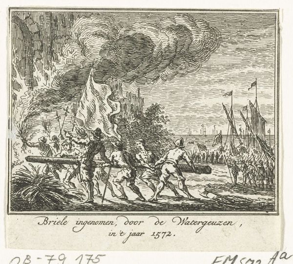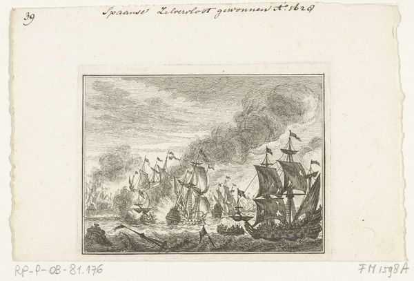 Curator: This is Simon Fokke's "Laatste zeeslag van Tromp, 1653," created sometime between 1782 and 1784. It's an etching, currently held here at the Rijksmuseum. Editor: It's certainly dramatic! The burning ship in the foreground immediately catches the eye, a stark image of destruction and the human cost of battle. Curator: Absolutely. Consider the process involved in creating this print. The fine lines etched into the metal plate, meticulously rendering the chaos of naval warfare, reflect the skilled labor required. Then there’s the labor to make it in the first place. And the paper! How many hands did this paper go through? This wasn't just for art consumption; it was about accessible imagery for a wide audience. Editor: Precisely! And the accessibility speaks volumes about the social and political landscape. This image of Tromp’s last battle served a crucial role in shaping national identity. Naval victories were powerful tools for nation-building. To whom was it supposed to appeal? It probably hung in a number of government buildings at one time, given its grand subject. Curator: Notice the focus on narrative. Fokke is not merely depicting ships; he’s telling a story. This print offered a readily available narrative for public consumption that elevated certain forms of manual labor into artistic labor by a privileged individual. Editor: Yes, and it reinforced particular ideologies about Dutch power and maritime strength. How this single etching might circulate tells you a lot about who controlled the image of the Dutch, who consumed that image, and how it served political or social agendas. Curator: Fokke transformed materials of the everyday like ink and paper, which we too often forget. By rendering a historic event, this becomes something powerful as people invest in Dutch legacy. The commodification of this kind of history through printed images allowed people to reflect on how it might support emerging ideas of Dutch national identity. Editor: Exactly! It allows a collective visual memory to spread and endure. An inexpensive item like this had immeasurable public impact on people's view of Dutch legacy, shaping perspectives through iconic imagery. Curator: Reflecting on the print, I’m reminded that art extends far beyond the aesthetic realm— it is entrenched in labor, production and consumption, as well as economic status. Editor: I’m leaving with a renewed sense of how art functions within the historical narrative and serves as a constant site for constructing and negotiating collective identities.